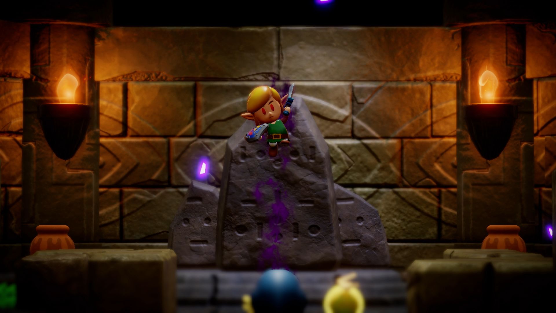 Am Ende des Dungeons winkt nicht nur der obligatorische Herzcontainer, sondern auch vom Himmel fallende Tris. Unser Begleiter erhält ein zusätzliches Tri, was bedeutet, dass wir fortan vier Echos gleichzeitig beschwören können. Level 2 – ein Levelsystem. Gelegentlich gab es schon zu Spielbeginn leichte Slowdowns, wenn ich drei bewegliche Echos (Fledermäuse zum Beispiel) in anspruchsvoller Umgebung sehr schnell hintereinander beschwört habe. Ich bin gespannt, wie viele Echos man im Endgame beschwören darf. Darüber hinaus lief die Demo technisch einwandfrei und war sehr schön anzusehen, ich mochte ohnehin schon den optischen Stil von Link’s Awakening für die Switch – sicherlich Geschmackssache. Zurück in den Dungeon: Obendrein erhalte ich fünf wundersame Kristalle, die meine Energia komplett wieder aufladen, weshalb ich vermute, dass man sie später zur Verlängerung des Energia-Balkens verwenden kann.
