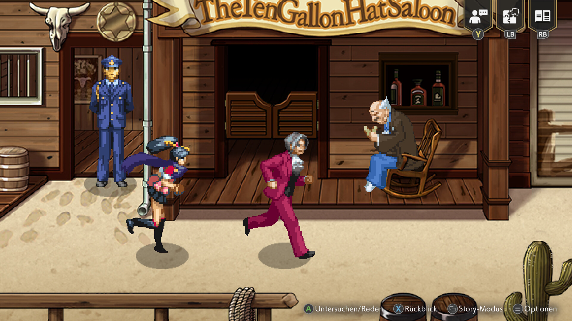 Sollten wir einmal nicht weiterkommen, können wir uns mit unseren Begleitern beratschlagen oder wir aktivieren über das Menü den bereits aus der Ace Attorney Trilogy bekannten Lesemodus. Dieser führt uns dann automatisch durch die Dialoge und löst die meisten Rätsel. Gepaart mit der Autoplay-Funktion, durch die die Texte weiterlaufen, können wir uns wahlweise also entspannt zurücklehnen und das Spiel als reine Visual Novel genießen.