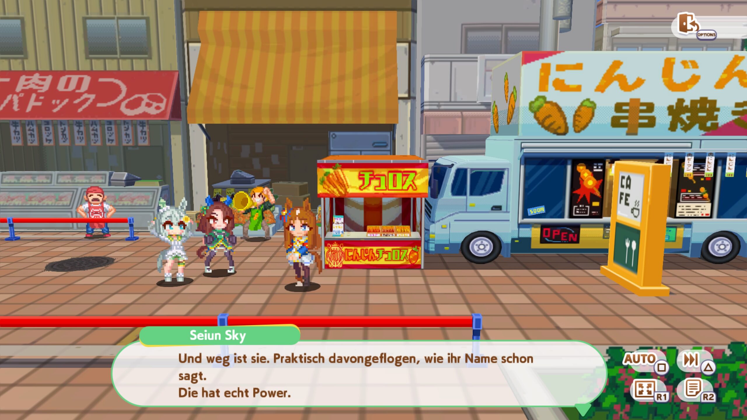Musikalisch geht es in Richtung erheiternde Beeps und Boops ohne viel Tiefgang, aber dennoch passend für den Inhalt des Spiels. Das Uma-Musume-Pretty-Derby-Theme findet natürlich auch sein Plätzchen und dürfte hiermit Fans durchaus erfreuen. In puncto deutscher Lokalisierung zeigt das Spiel aber ein paar Schwächen. Manche Szenen im Storymodus sind unübersetzt auf Englisch gehalten und der Golshi-Modus kommt komplett ohne deutsche Texte daher. Betrachtet man den doch kleinen Umfang des Spiels, ist das schon mehr als verwunderlich.