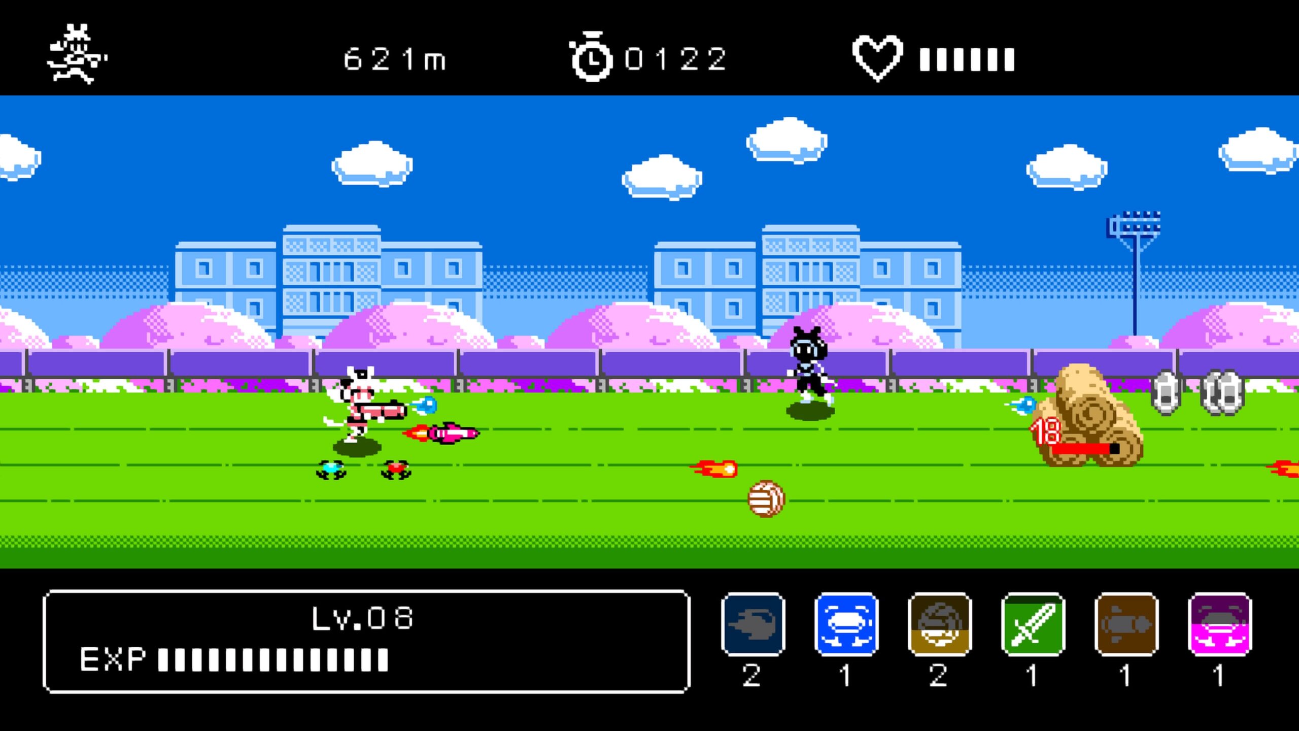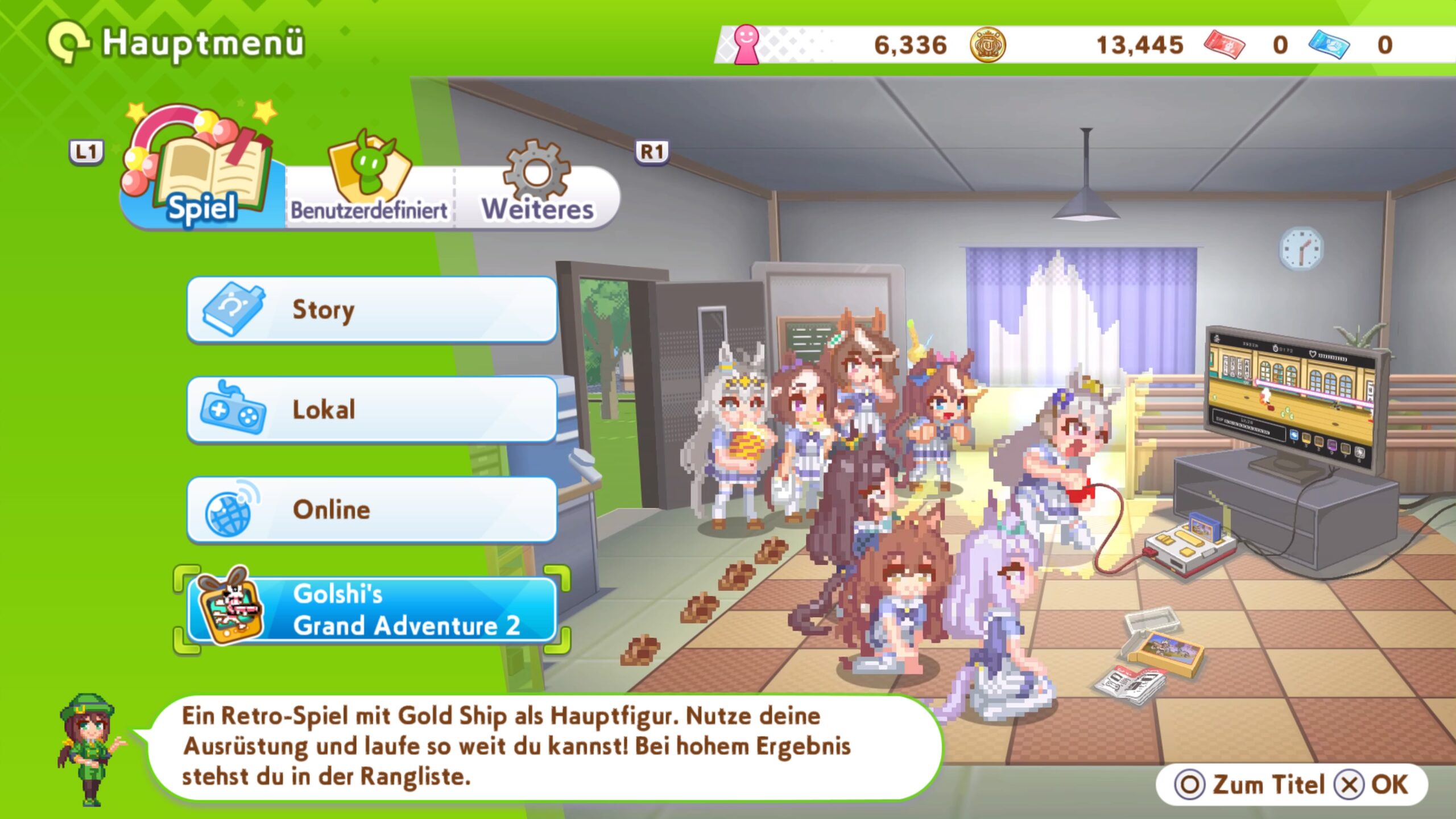 Kauft man sich im Ingame-Shop eine Videospiel-Konsole, schaltet man ein weiteres Spiel frei, das komplett aus dem etablierten Rahmen herausfällt. In Golshi’s Grand Adventure 2 spielt man ein Roguelight-Pferderennen im Retro-Look. Hier läuft man auf einer Rennbahn, besiegt Gegner und weicht Hindernissen aus. Dabei sammelt man Erfahrungskristalle, Münzen und Ausrüstung ein. Levelt man auf, so bekommt man die Möglichkeit eine Waffe auszuwählen oder aufzuleveln. Die persönliche Erfahrung durch das Trial-and-Error-Prinzip und gesammelte Ausrüstung machen hier jeden Lauf besonders und heben diesen Modus wohl zum wirklichen Highlight des ganzen Spiels.