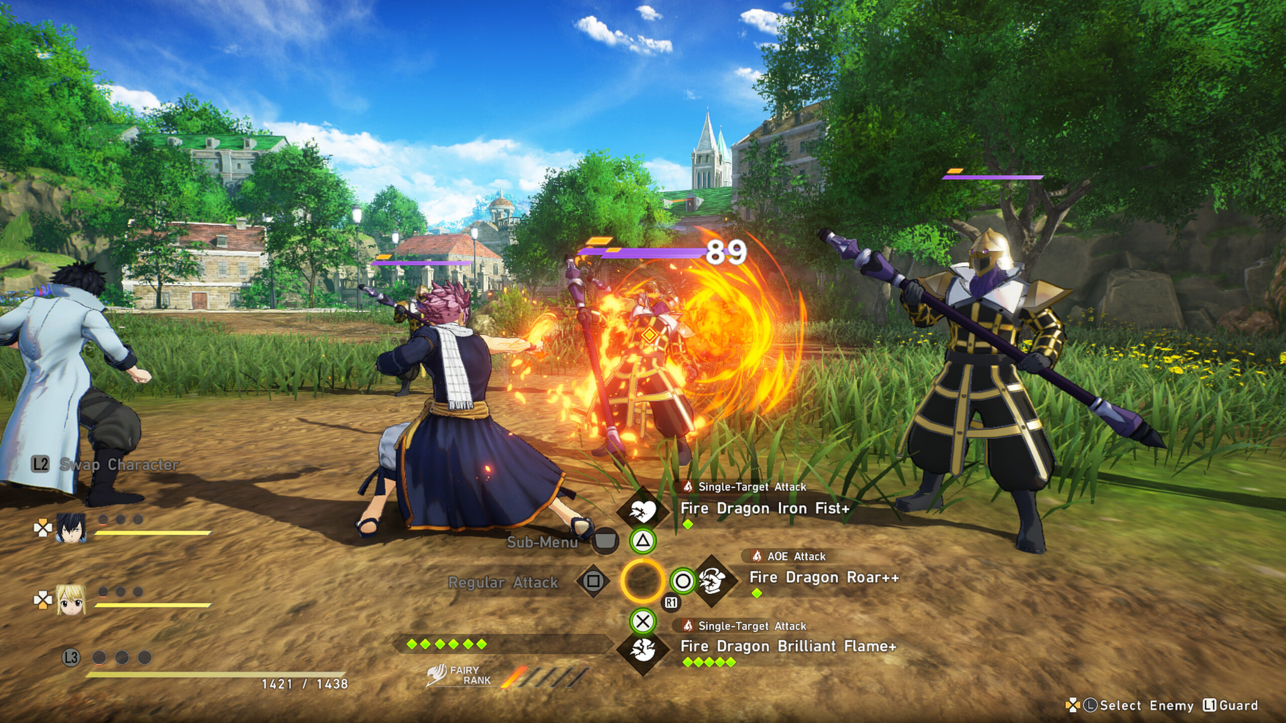 So füllt sich während eines Kampfes unter anderem die sogenannte „Fairy Rank“-Anzeige, die nicht nur eure SP-Leiste erweitert, sondern je nachdem, wie weit sie gefüllt ist, gesonderte Spezialangriffe ausführt. Das können mächtige Angriffe der Geschwister Lisanna und Elfman auf den Gegner sein, bis hin zu Heilungsbuffs von den drei Exceed.