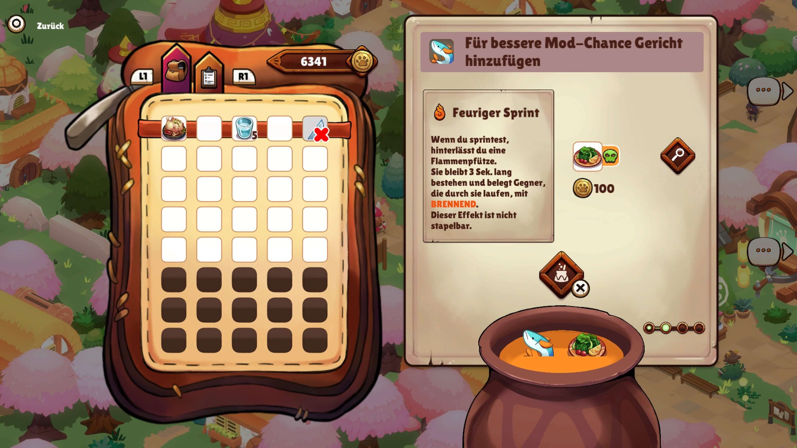 Optisch ist alles komplett aufs Thema Essen ausgelegt. Unsere Waffen sind Pfannenwender, Teller, Schwertfische, Eierbomben und mehr, unsere Lebensleiste wird als Löffel dargestellt und Heiltränke sind natürlich Bobas, auch bekannt als Bubble Tea. In unserem Rucksack verstauen wir Zutaten und andere Fundsachen und müssen dabei gut überlegen, was wir mitnehmen wollen, denn ohne Upgrades können wir nur zehn verschiedene Objekte mit uns führen.