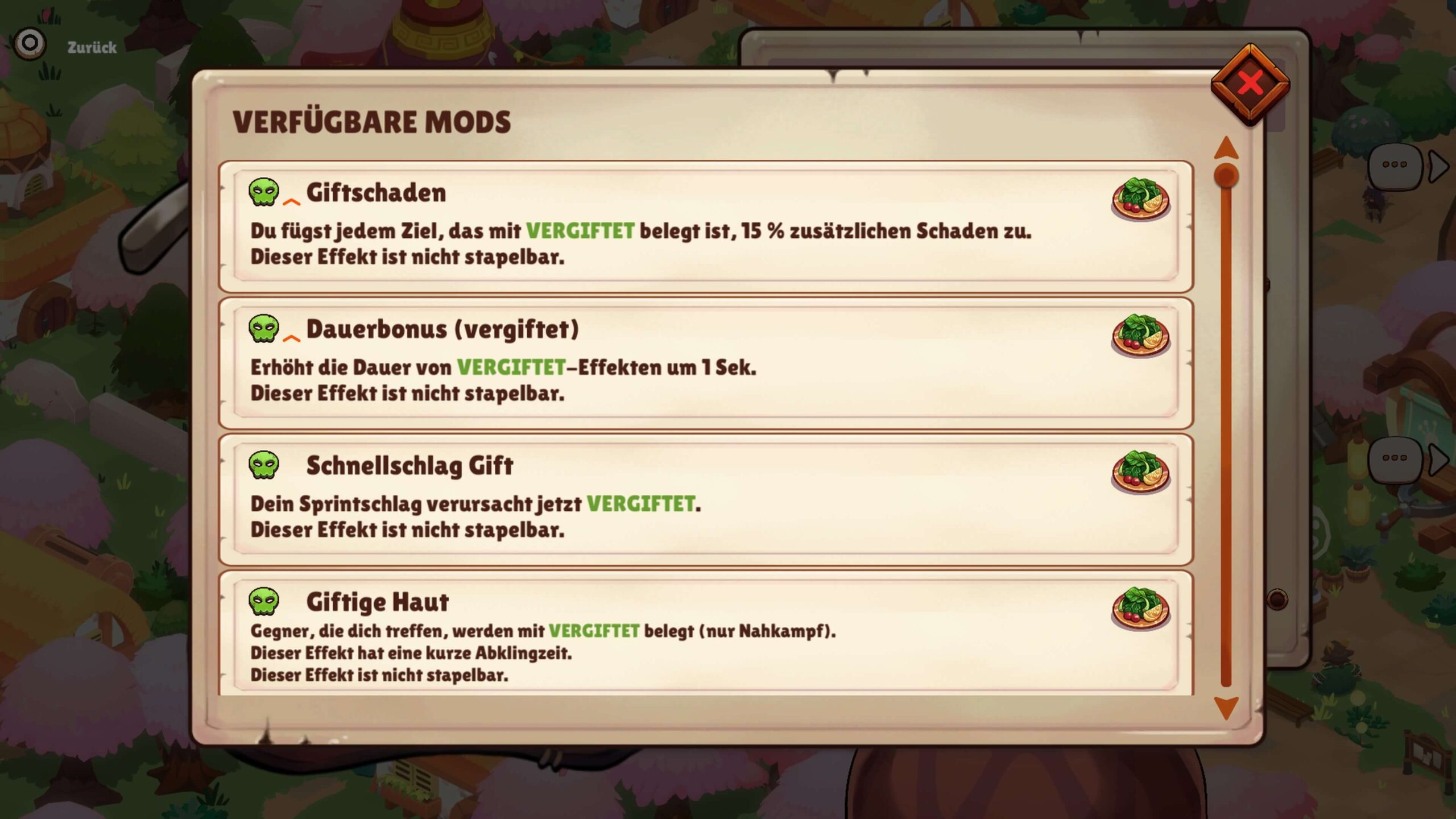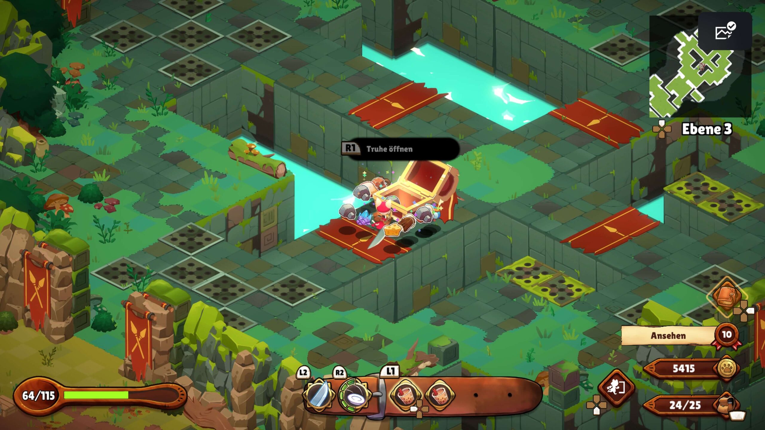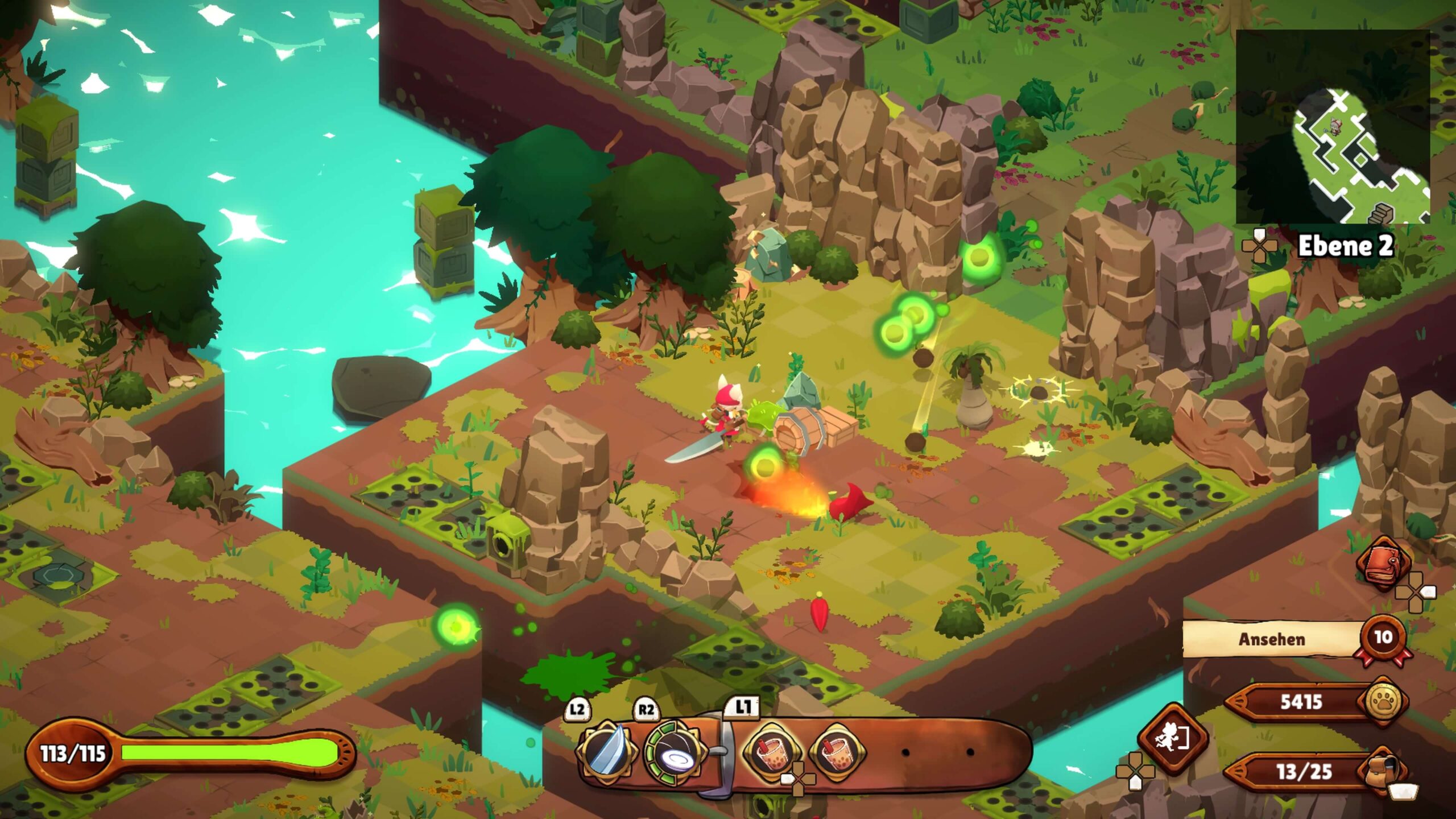 Poms Waffen sind anfangs noch sehr schwach, alle Gegner benötigen mehrere Schläge, bis sie in ihre Zutaten zerpuffen. Dadurch kommt man schnell in brenzlige Situationen, in denen sich die Lebensleiste schneller leert als ein Kaffee an einem Montagmorgen. Eine unvorsichtige Bewegung oder an einem winzigen Busch hängen geblieben, und schon sieht sich Pom die Radieschen von unten an. Die Folgen einer Niederlage sind katastrophal, denn mehr als die Hälfte der hart erbeuteten Ressourcen geht dabei verloren. Das wird umso frustrierender, je mehr Zeit man im Dungeon verbracht hat. Zum Glück hat uns Biscotti ein Amulett mitgegeben, das uns jederzeit nach Hause teleportieren kann. Allerdings benötigt dies etwas Zeit, daher suchen wir uns dafür eine ruhige Ecke aus.