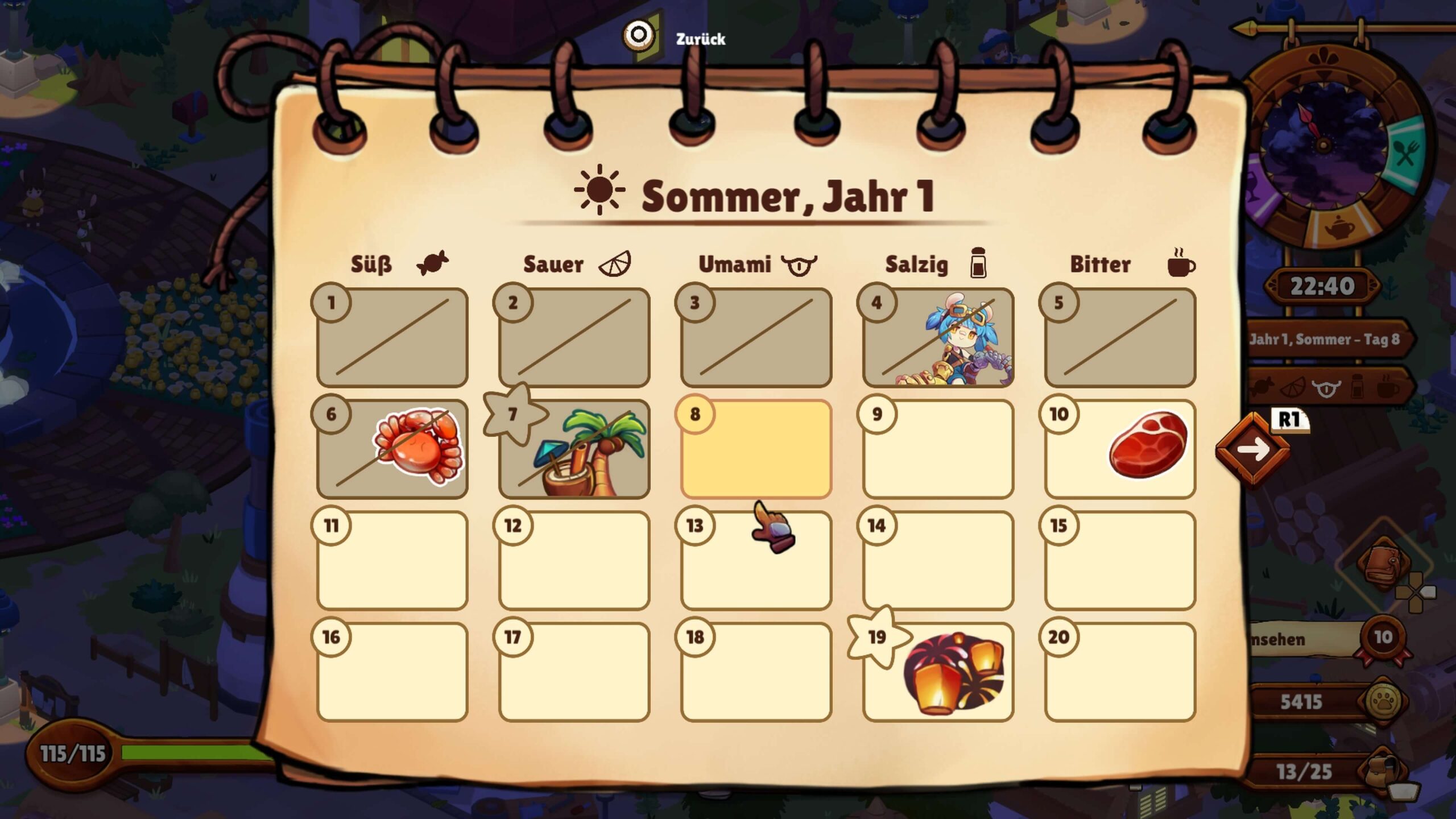 Die meisten Aufgaben bestehen darin, die wertvollen Zutaten im Austausch für ein Rezept rauszurücken, andere Dörfler wollen ein bestimmtes Gericht gekocht und geliefert bekommen. Die benötigten Mengen hierfür sind teilweise sehr absurd, beispielsweise möchte ein Junge zehn Pizzen haben. Hierfür brauchen wir nicht nur eine Menge Zutaten, sondern auch das passende Küchengerät, das wir erst bei Alder kaufen müssen.
