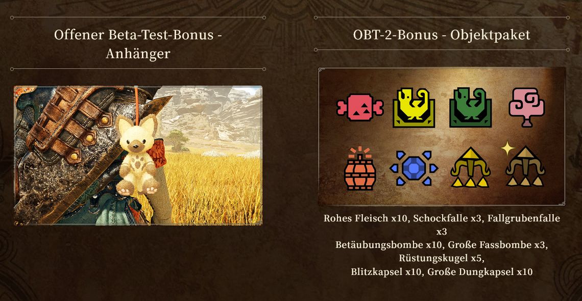 Capcom belohnt Beta-TeilnehmerInnen übrigens mit exklusiven Boni für die spätere Vollversion. Wer an einer der beiden Beta-Phasen teilgenommen hat, erhält einen „Open Beta Test“-Bonusanhänger im niedlichen Felyne-Design, mit dem sich Waffen dekorieren lassen. TeilnehmerInnen konkret der zweiten Beta erhalten zudem ein spezielles Item-Paket mit hilfreichen Gegenständen für die Jagd im Hauptspiel.