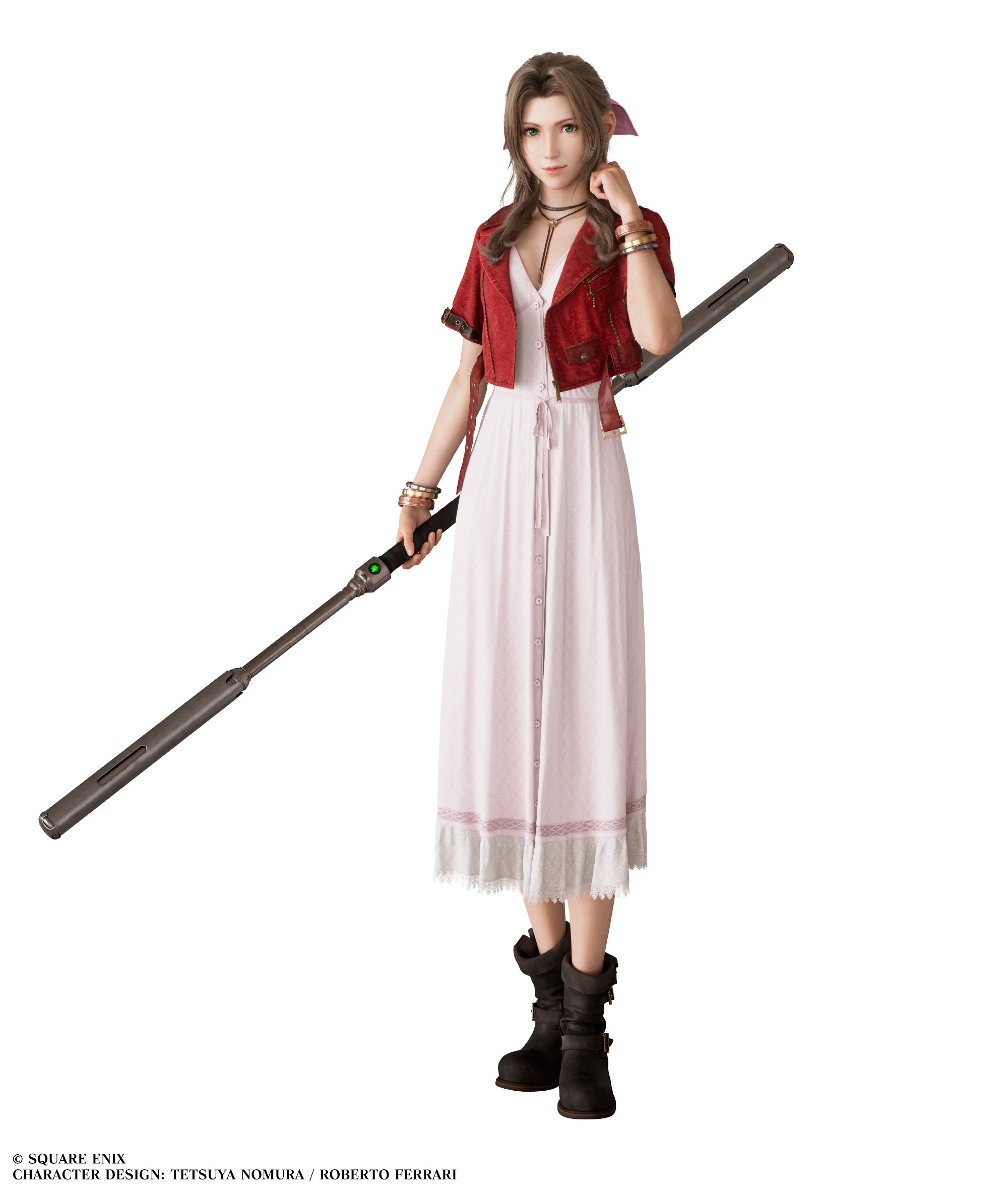 In dem Twitter-Beitrag geht es zunächst um die Ganzkörperpose. Die aufrechte Haltung auf diesem Bild soll das Wesen von Aerith widerspiegeln, das „sanft, aber mit einem festen Kern“ ist. Dies wird durch eine gerade Körperhaltung mit einem stabilen Schwerpunkt ausgedrückt, während sanfte Kurven beibehalten werden. Sogar die Haltung ihrer Finger, der Winkel ihres Ellenbogens und ihr Griff am Stab wurden bewusst gestaltet, um ein Gefühl von Feinfühligkeit zu vermitteln.