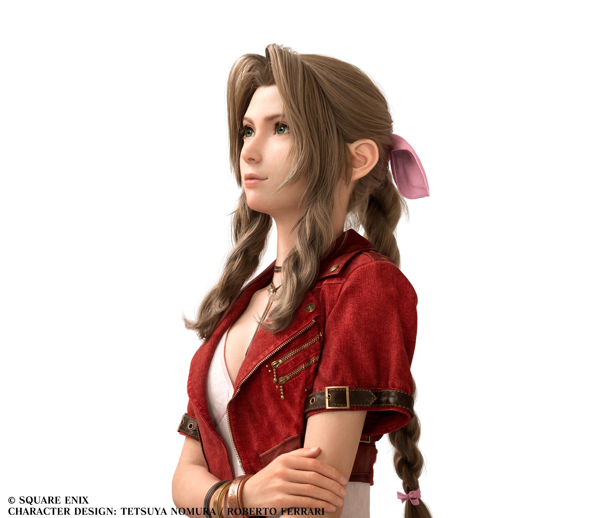 Diese Pose ist euch aus dem Spiel sicherlich auch bekannt, ein offizielles Render von Aerith zeigt sie auch: Aerith verschränkt vermeintlich die Arme, aber nicht so, wie ihr es intuitiv tun würdet. Ihre Hand verschwindet nicht unter dem Ellenbogen, sondern legt sich von außen auf ihn drauf und es sieht fast so aus, als würde sich Aerith „selbst umarmen“ – alles kein Zufall, wie die Entwickler erklären.