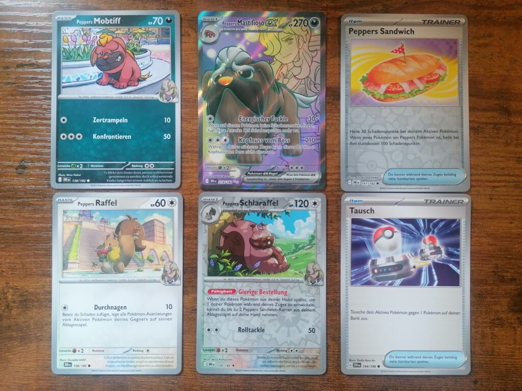 Wir hatten das Glück, in einem Booster Peppers Mastifiosi-ex zu ziehen. Mit 270 KP ist das Oberhaupt-Pokémon ein echtes Schwergewicht, das mit „Kopfnuss vom Boss“ 210 Schadenspunkte austeilt. Mit Peppers Sandwich gibt es eine nützliche Itemkarte in der Erweiterung. 30 Schadenspunkte beim aktiven Pokémon zu heilen, ist nicht außergewöhnlich. Aber wenn jenes Pokémon ein Pokémon von Pepper ist, werden stattdessen 100 Schadenspunkte geheilt!
