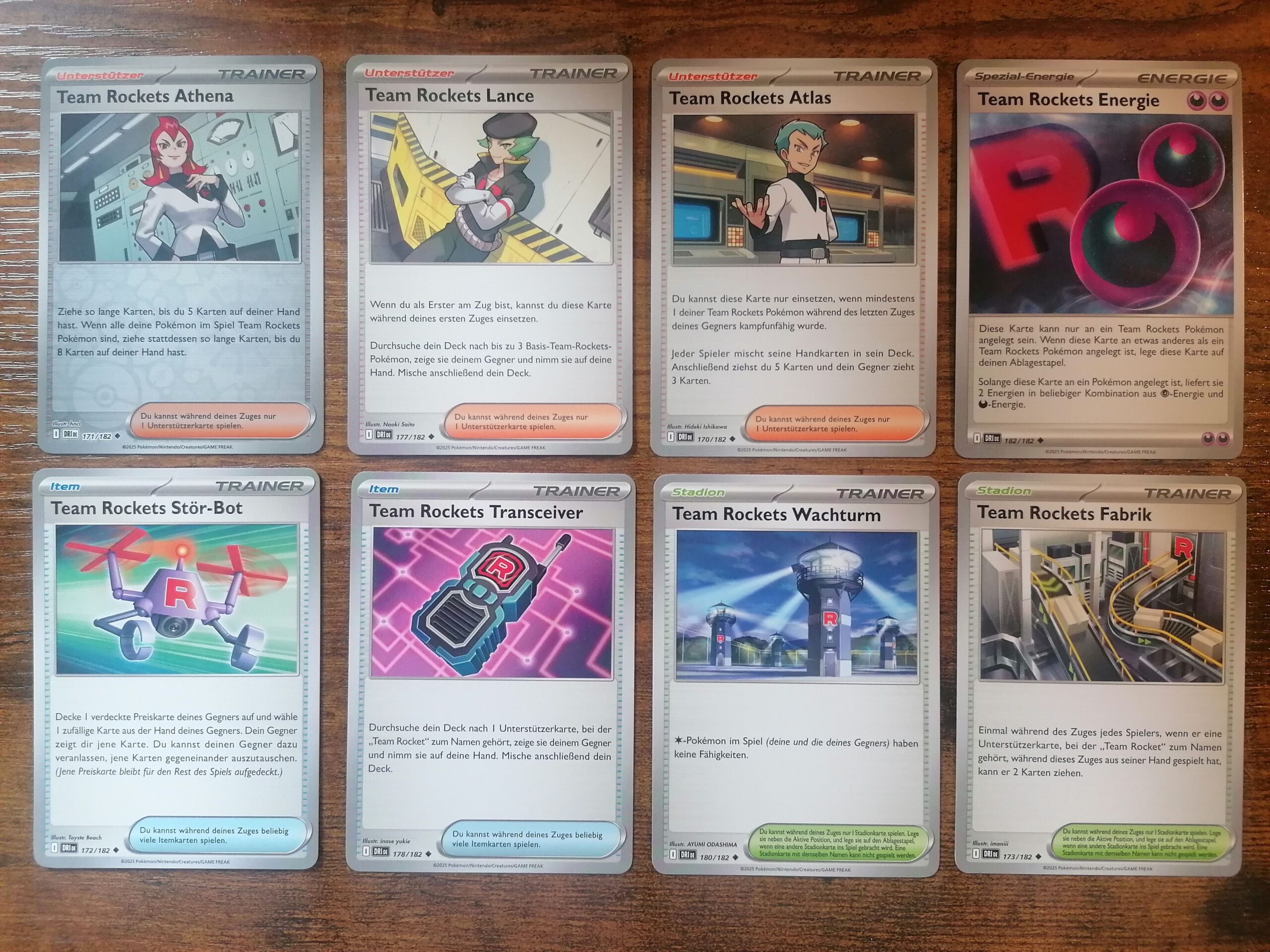 Auffällig ist natürlich auch, dass Team Rocket auch Unterstützerkarten, Itemkarten und Stadionkarten unterwandert. So gibt es zum Beispiel drei Unterstützerkarten von Team Rockets Atlas, Lance und Athena mit unterschiedlichen Spielfunktionen.