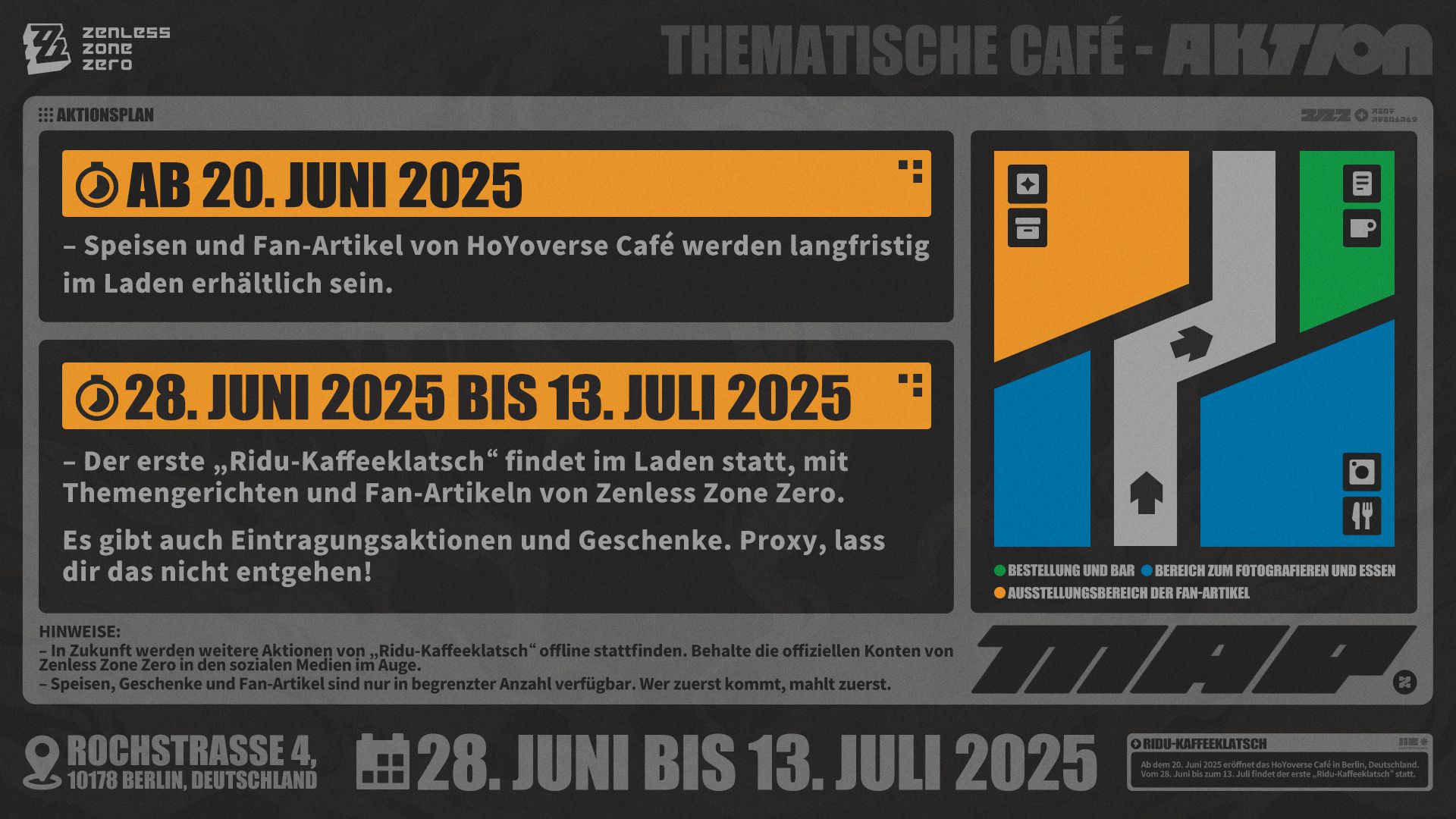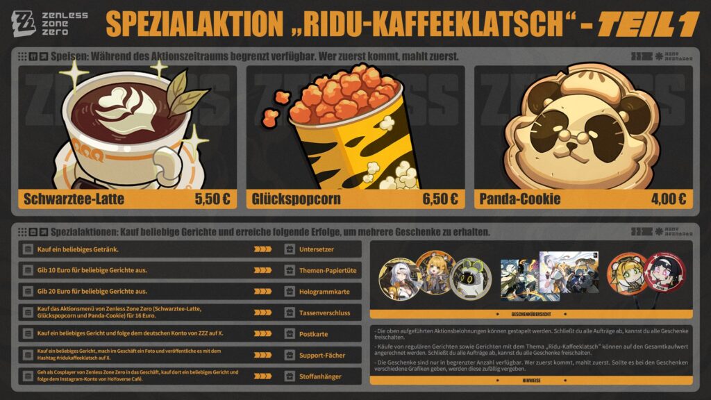 Es folgt direkt im Anschluss das erste Event zu Zenless Zon Zero. Vom 28. Juni bis 13. Juli feiert das Spiel mit dem ersten „Ridu-Kaffeeklatsch“ sein einjähriges Jubiläum. Exklusive Speisen und Getränke locken, die von der urbanen Welt von New Eridu und ihren Charakteren inspiriert sind. Auch Fan-Artikel wie Fächer und Amulette sind Teil des Events. Eine Anmeldung ist hier notwendig.