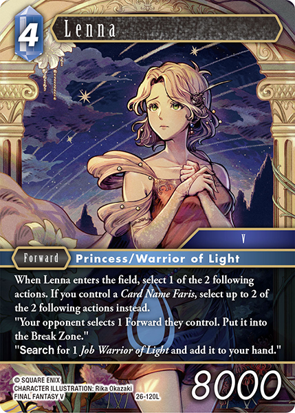 Wie breitgefächert das Angebot auch von „Gunslinger in the Abyss“ ist, zeigt die nächsten Karten. Die widmen sich nämlich Faris und Lenna aus Final Fantasy V. Faris [26-014L] zeigt eine Illustration von Rina Yoshiura und Lenna [26-120L] bietet eine neue Zeichnung von Rika Okazaki. Beide Künstler steuern damit ihre ersten Motive zum Final Fantasy Trading Card Game bei. Und die können sich sehen lassen, oder? Mehr zu den spielerischen Hintergründen der Karten erfahrt ihr hier.