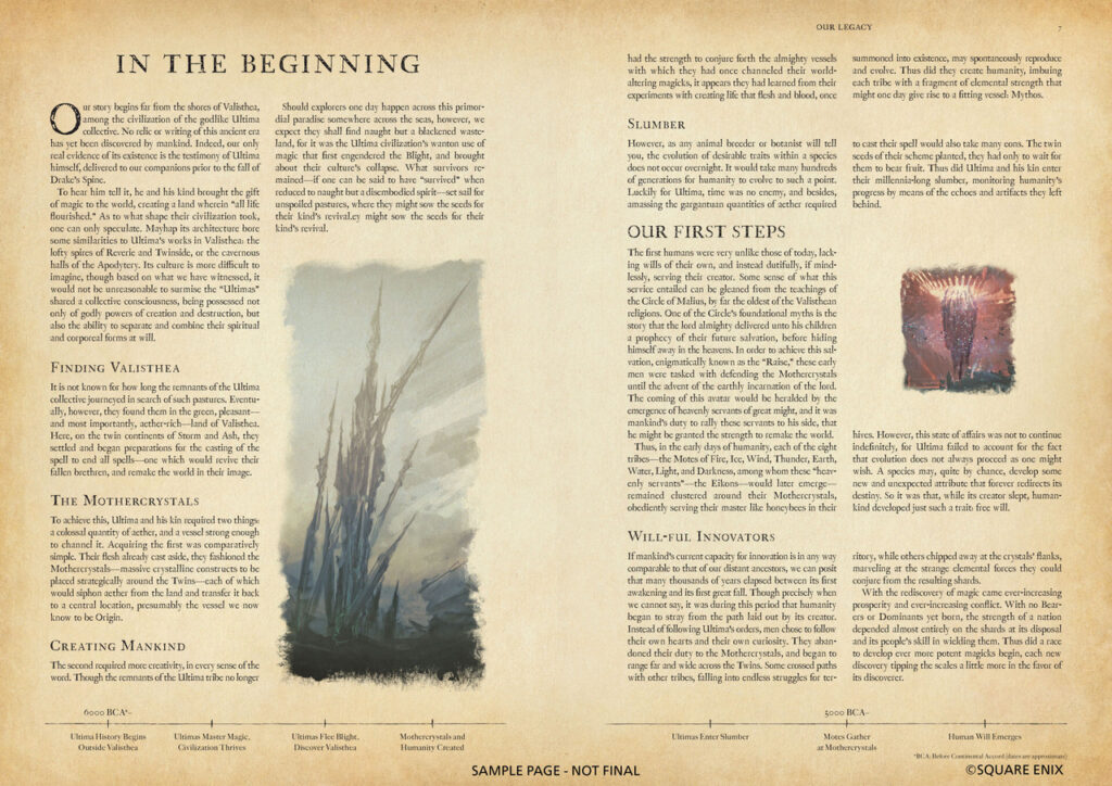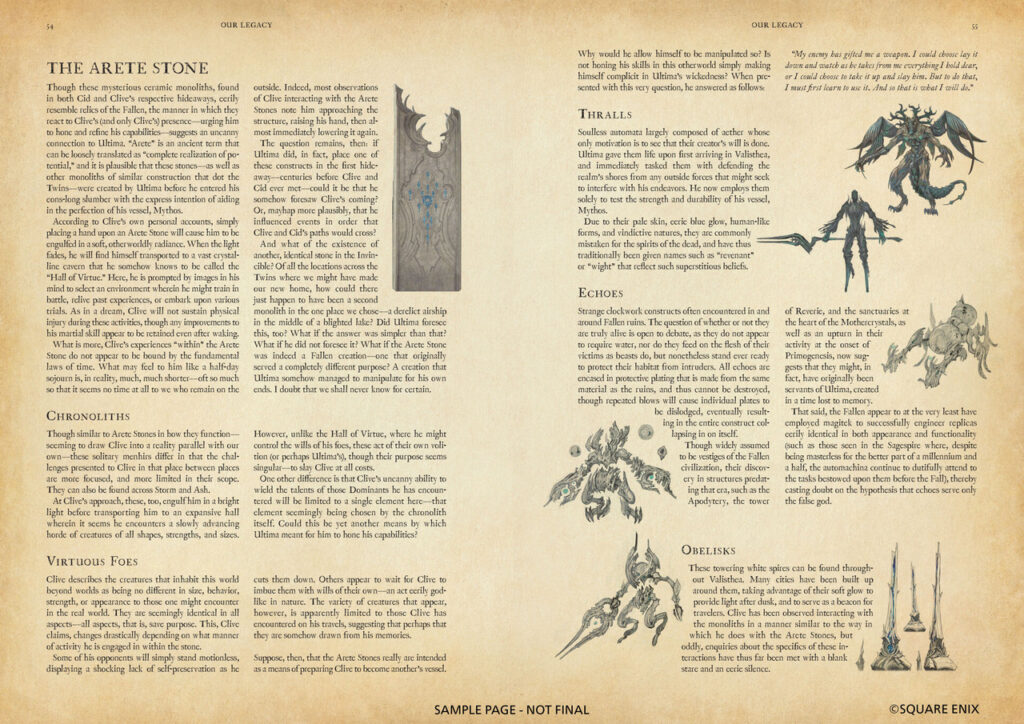 „Diese Sammlung, die vom valistheischen Gelehrten und Historiker Harpokrates Hyperboreios II. verfasst wurde, entführt Leser tief in die Überlieferungen von Final Fantasy XVI. Sie erkundet eine Vielzahl Themen, von Musik über Literatur bis zu Religion – und sogar die Kochkunst! – durch zahlreiche Einträge, die aus Tagebüchern, Briefen und Unterhaltungen übertragen wurden. LOGOS ist mehr als nur eine Enzyklopädie: Es ist ein Fenster in die Welt von Valisthea und die Leben ihrer Einwohner, wie von diesen Einwohnern selbst beschrieben“, heißt es.