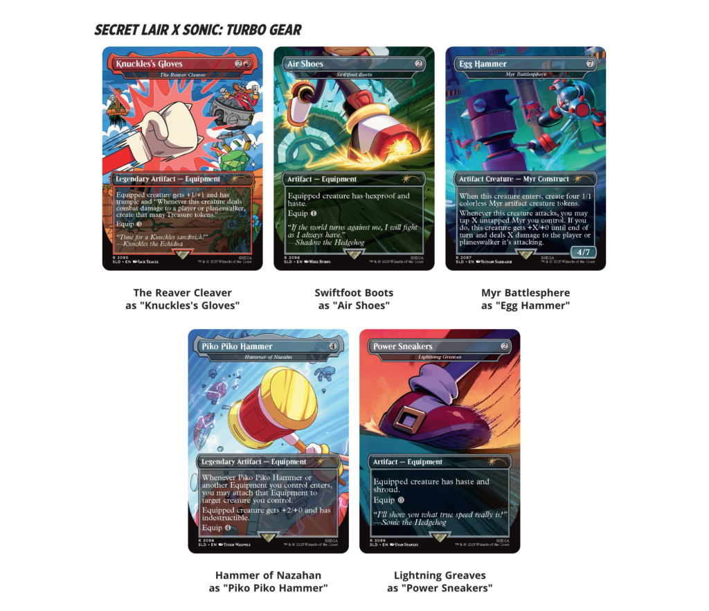 In diesem Fall enthält der „Turbo Gear“-Drop sechs bestehende Magic-Karten, die mit neuen Illustrationen und Namen im Sonic-Stil überarbeitet wurden, sowie eine Token-Karte. Dazu gehören auch ein paar passende Klassiker aus Magics beliebtem Commander-Format, wie Swiftfoot Boots und Lighting Greaves – denn Sonics Schuhe verdienen natürlich ihre eigenen Karten.