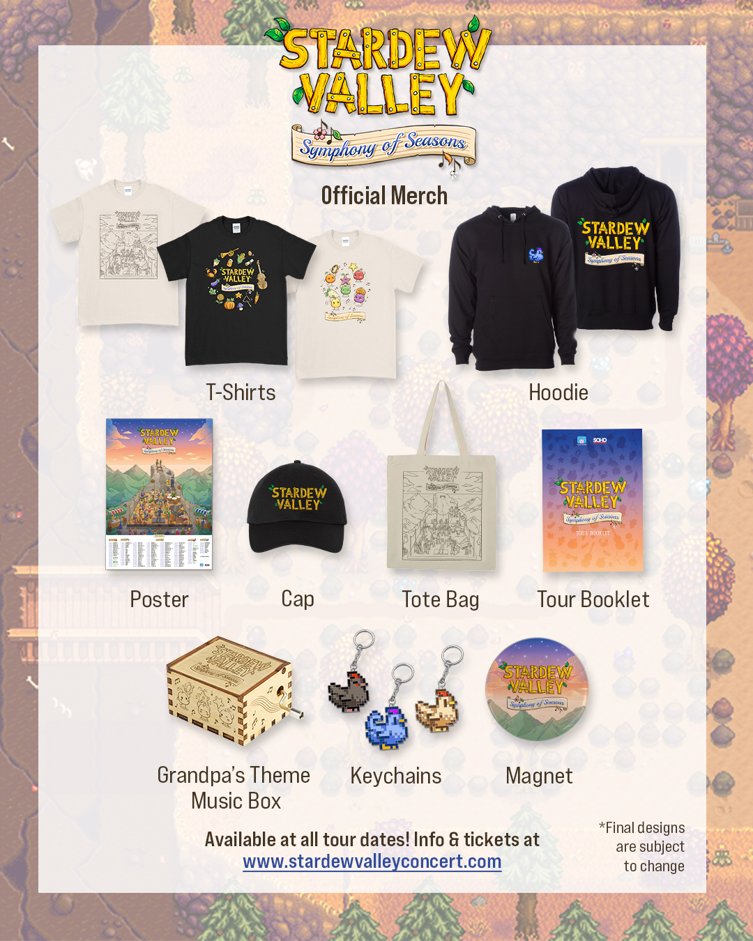 Aus diesem Anlass gibt es auch neues Merchandise, zum Beispiel das Junimo-T-Shirt, eine Spieluhr, ein Stoffbeutel, brandneue Hühner-Schlüsselanhänger und vieles mehr. Erhältlich sind diese vor Ort bei allen „Symphony of Seasons“-Konzerten. Zu einem späteren Zeitpunkt soll das Merchandise auch online erhältlich sein.