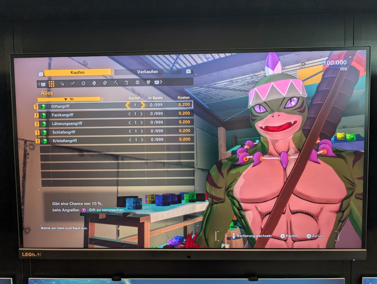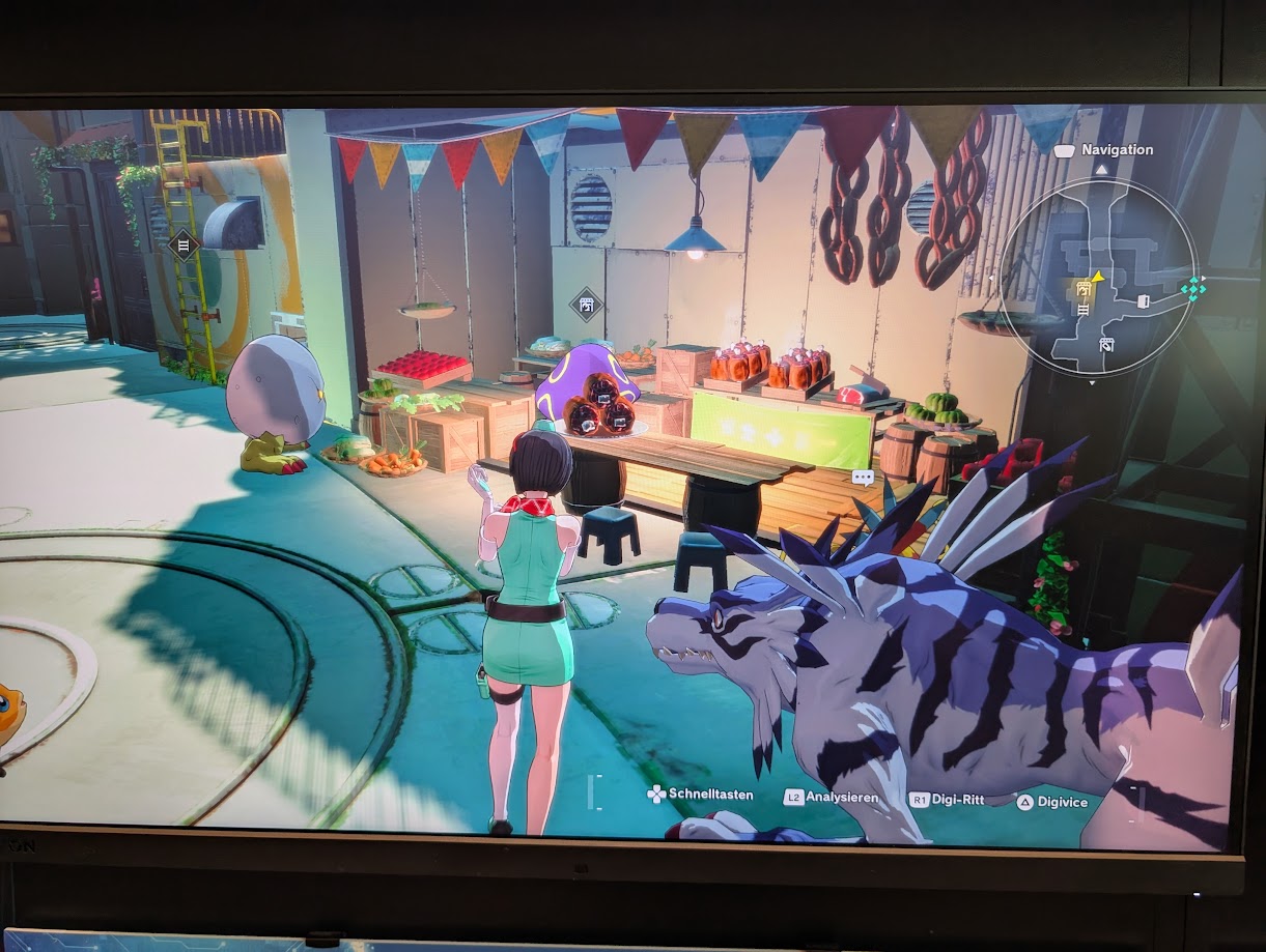 Nachdem wir als „seltsame Kreatur“ (sprich: Mensch in der Digi-Welt) von Kapurimon im Spiel begrüßt wurden, statten wir uns und unsere Digimon in den Shops mit den nötigen Items aus. Danach erkunden wir die Stadt auf eigene Faust und ignorieren den Questmarker gekonnt.
