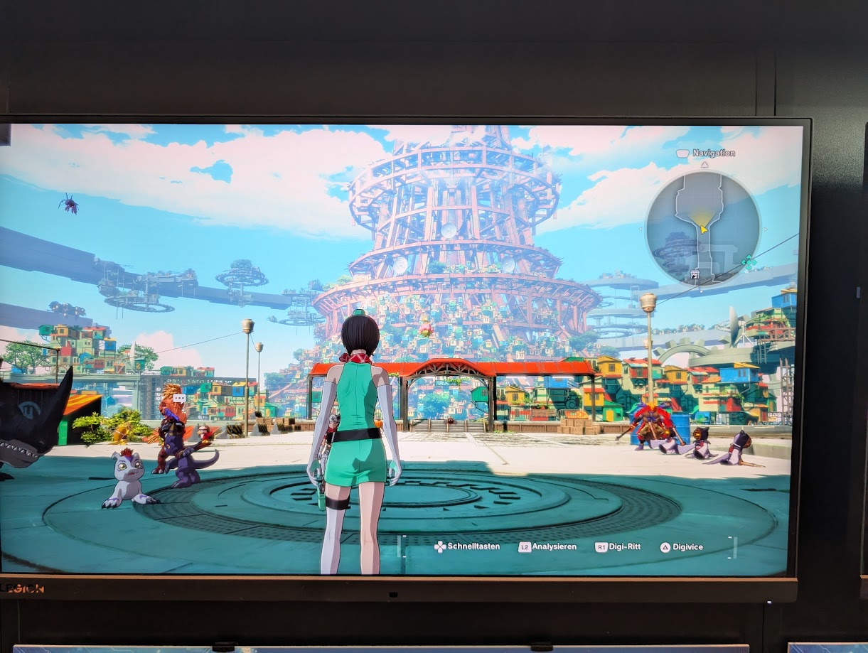 Die Weitsicht im Spiel ist sehr gut, was mit einem großen Kameraschwenk über die Stadt direkt zum Start demonstriert wird. Weniger gut, aber Digimon-Story-typisch, sind die Laufanimationen. Sie wirken etwas unrund und gelegentlich stockend, bei den Partner-Digimon wirkt es manchmal weiterhin, als ob sie über den Boden gleiten statt laufen würden. Besonders ärgerlich ist das deshalb, da man einige seiner Digimon-Partner nun reiten kann, die Animation wird also zentral im Bild angezeigt.