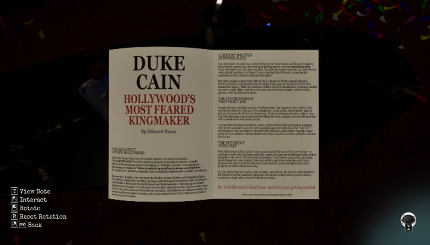 Durch das Lösen von Puzzles im Thema Hollywoods öffnet Ihr immer mehr Räume und findet neues Film-Material, das Ihr im Villa-eigenen Heimkino ansehen könnt. Die Story wird durch diese kurzen Videos, durch Dioramas oder Soundeffekte erzählt. Was in der Geschichte über Freundschaft, Verrat und die Schattenseiten der Filmindustrie wirklich passiert ist und was Chase lediglich halluziniert, lässt das Spiel offen.