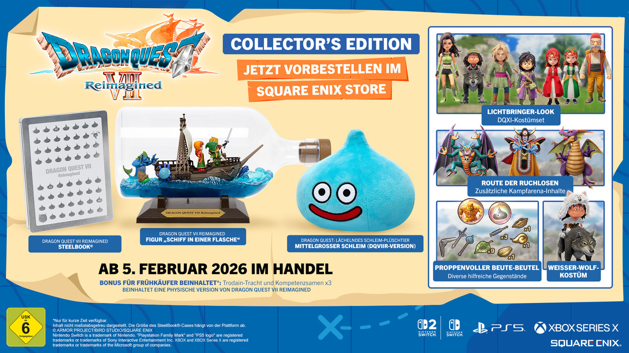 Die Collector’s Edition für Sammler und eingefleischte „Dragon Quest“-Fans ist ausschließlich über den Square Enix Store vorbestellbar und in limitierter Auflage verfügbar. Sie wird für alle Plattformen angeboten: Nintendo Switch 2, Nintendo Switch, PlayStation 5 und Xbox Series X|S.