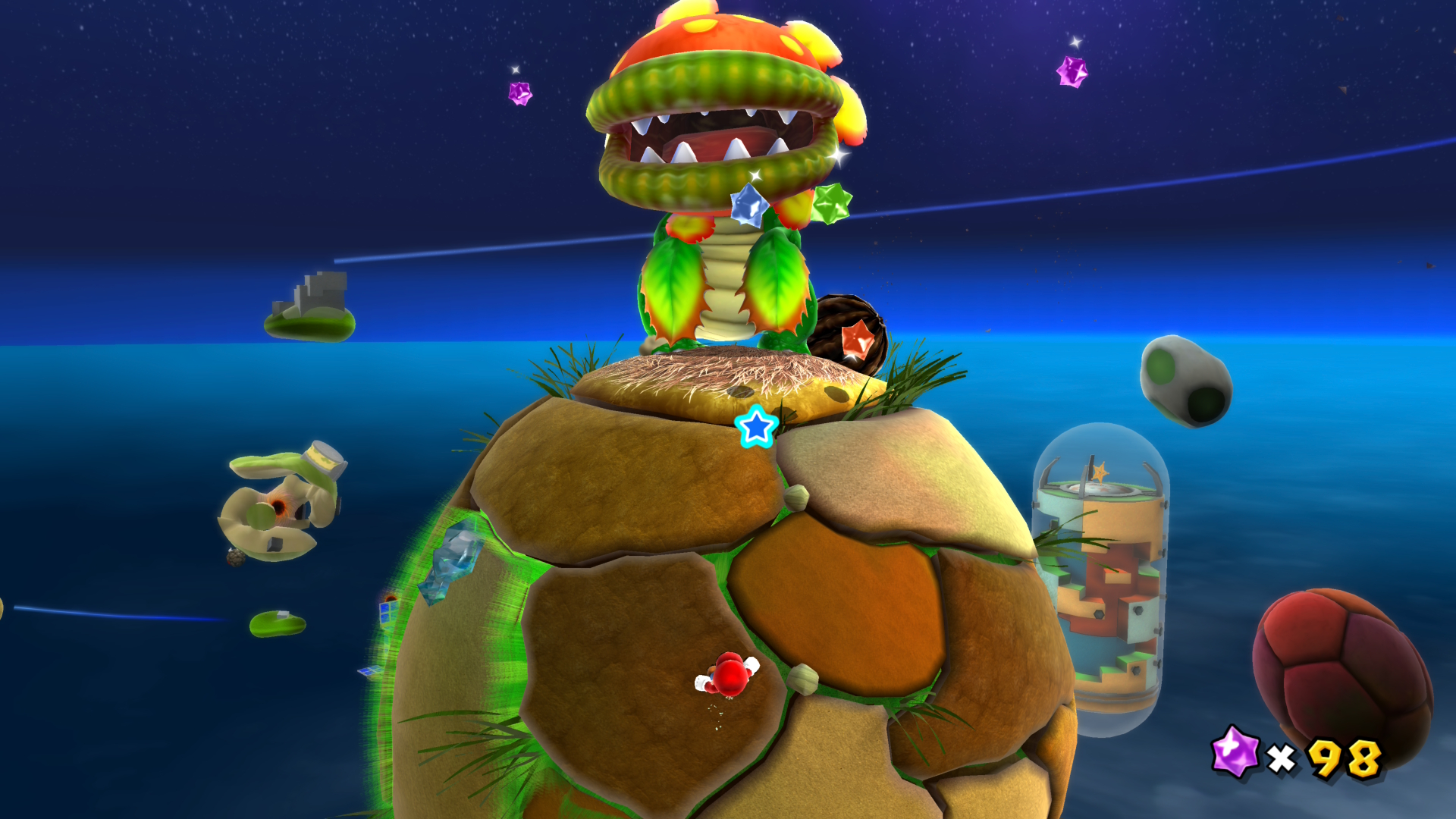 Ursprünglich erschienen, wie bereits erwähnt, beide Super-Mario-Galaxy-Spiele auf Nintendo Wii. Das bedeutet: Natürlich musste die Wii-Fernbedienung irgendwie eingebaut werden. In diesem Falle nutzt ihr auch auf der Nintendo Switch einen Pointer auf dem Bildschirm, um Dinge auszuwählen oder zu greifen. An blauen Sternen kann Mario sich damit entlangziehen oder mit dem Sternenpointer zahlreiche Sternenteile aufsammeln. Diese zählen als eine Art Währung neben den bekannten Münzen und können zum Verfüttern an Luma genutzt oder als kleine Hilfe im Kampf gegen Feinde verwendet werden. Außerdem wird der Pointer zum Navigieren von Menüs verwendet.