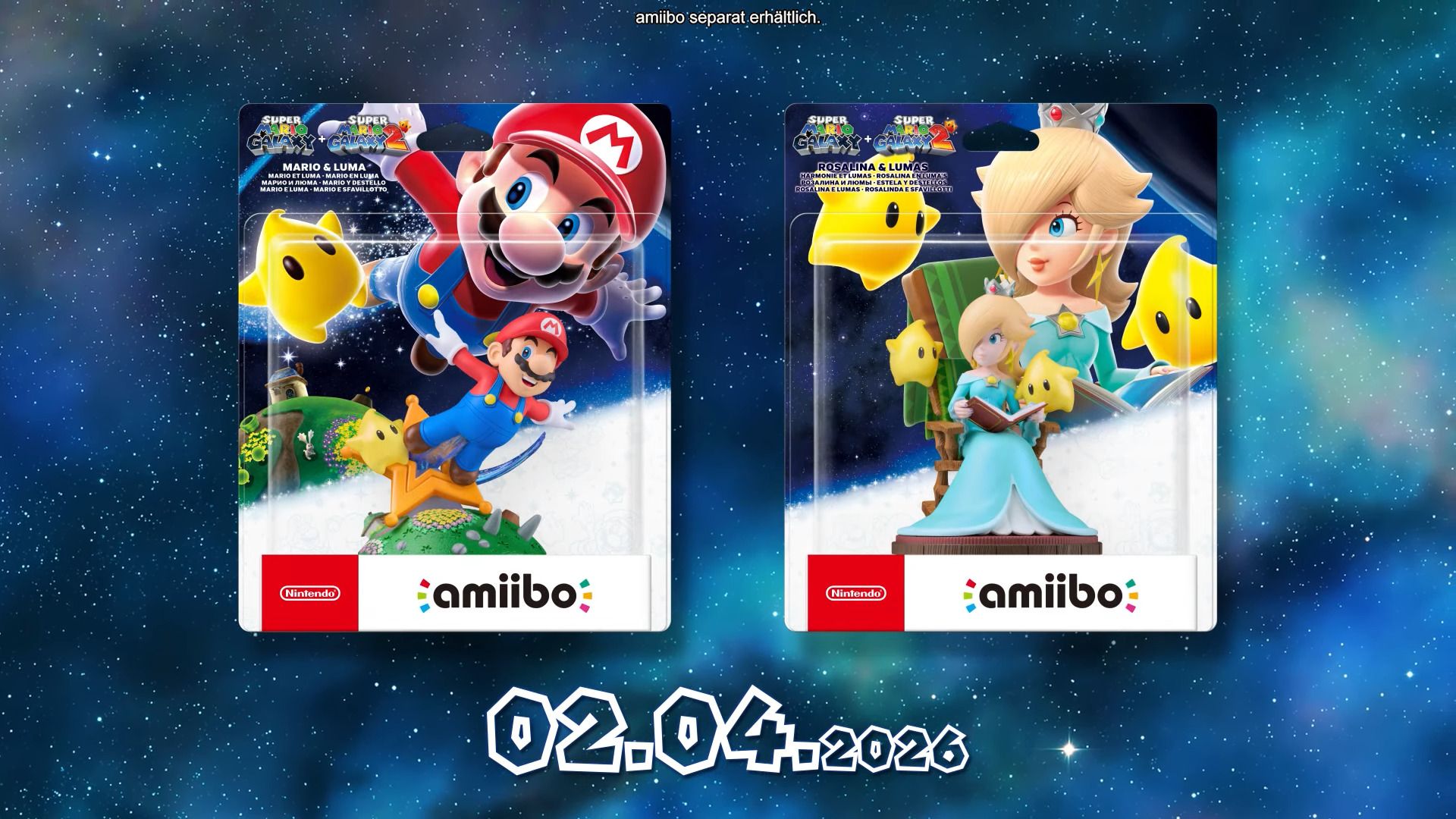 Parallel zur Collection wurden zwei neue amiibo angekündigt: Mario zusammen mit einem Luma sowie eine neue Rosalina-Figur. Beide erscheinen allerdings erst am 2. April 2026 – also ein halbes Jahr nach dem Spiel selbst. Vorbestellungen sollen laut Nintendo im Frühjahr starten.