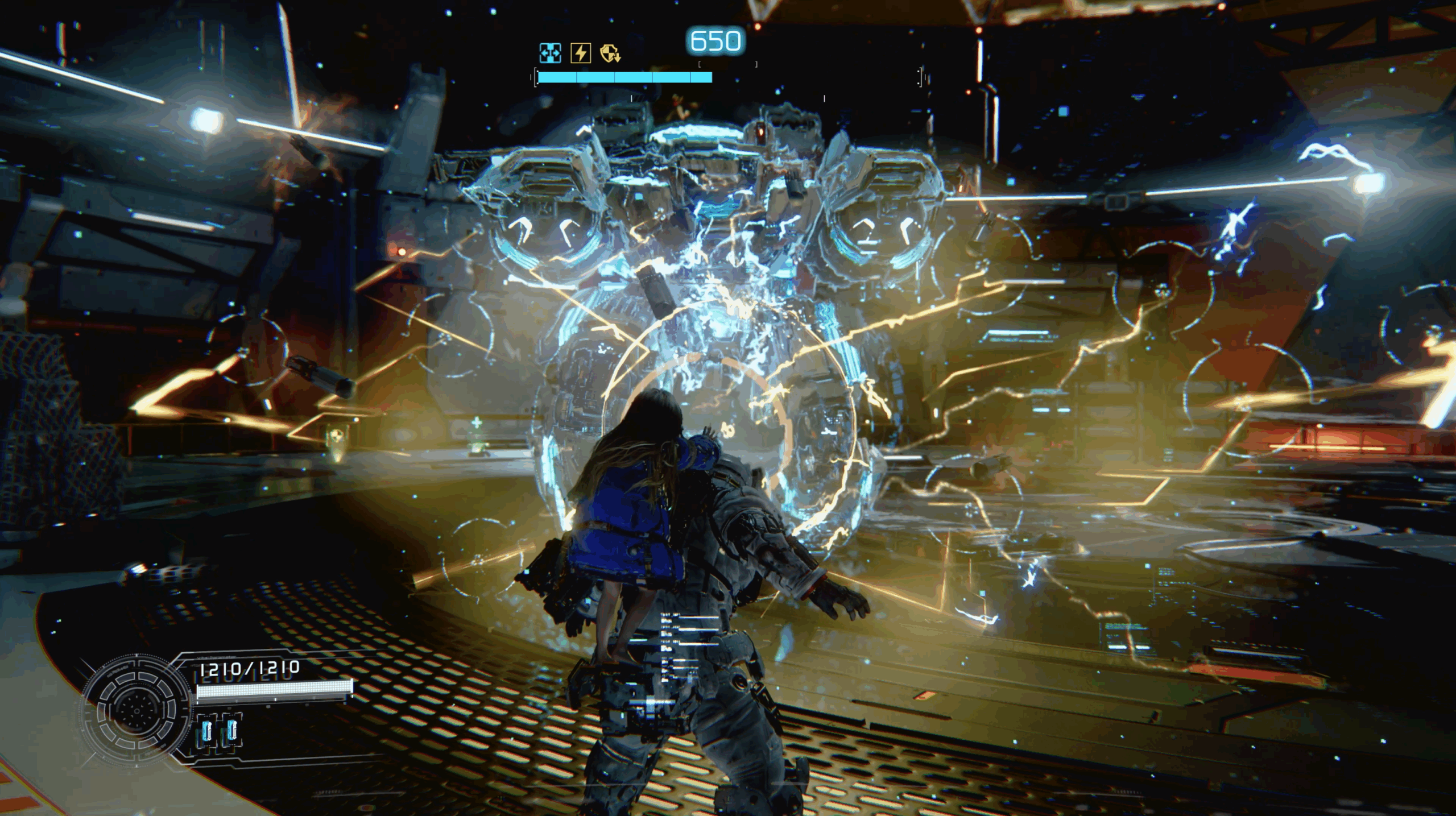 Das spielerische Highlight: Mussten wir im Zuge der ersten Hands-on-Session noch widerwillig den Controller aus der Hand geben, als sich mit einem gewaltigen Mech der erste Bossgegner ankündigte, ging es diesmal actionreich auf Tuchfühlung. Wir legen wie gewohnt die Schwachstellen der metallischen Bestie via Hacking-Angriff frei, weichen zusätzlich aber Sturmangriffen und Raketensalven aus. Nimmt der Boss genug Schaden, gilt es sein Taumeln mit einem satten Spezialangriff zu bestrafen, ehe wir letztlich zum verheerenden Overdrive-Finisher ausholen.