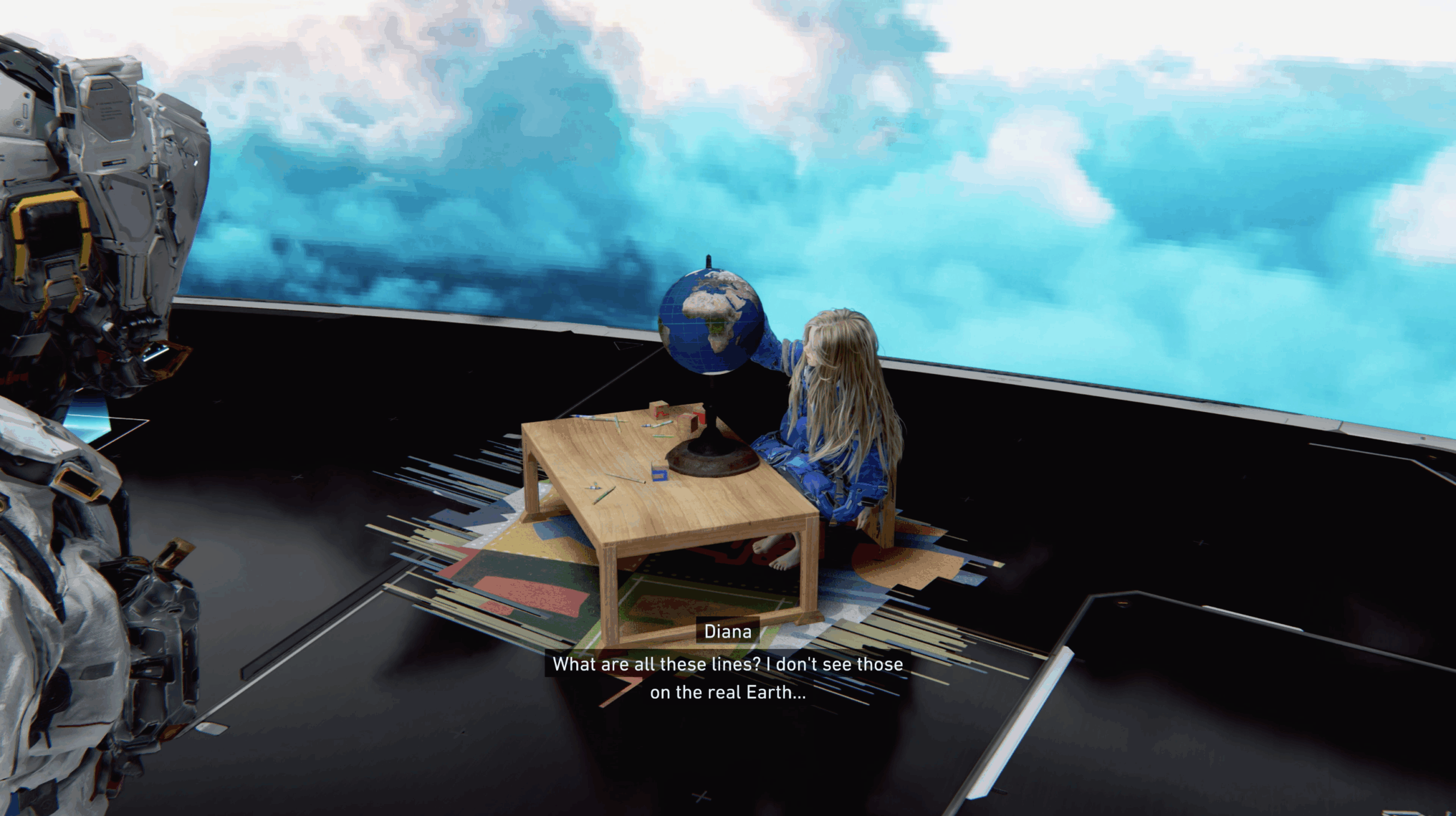Einmal eingesammelt, nehmen die Figuren dann in unserem Hauptquartier Platz; inwiefern Eure Sammelwut im fertigen Spiel belohnt wird, muss sich noch zeigen. Ja und dann wären da noch Gegenstände, die wir Diana schenken können, um unsere Bindung zu vertiefen. Das resultiert in knuffigen Interaktionen zwischen den beiden ProtagonistInnen, während Diana ihre Neugierde an Wachsmalstiften oder auch einem Globus befriedigt.