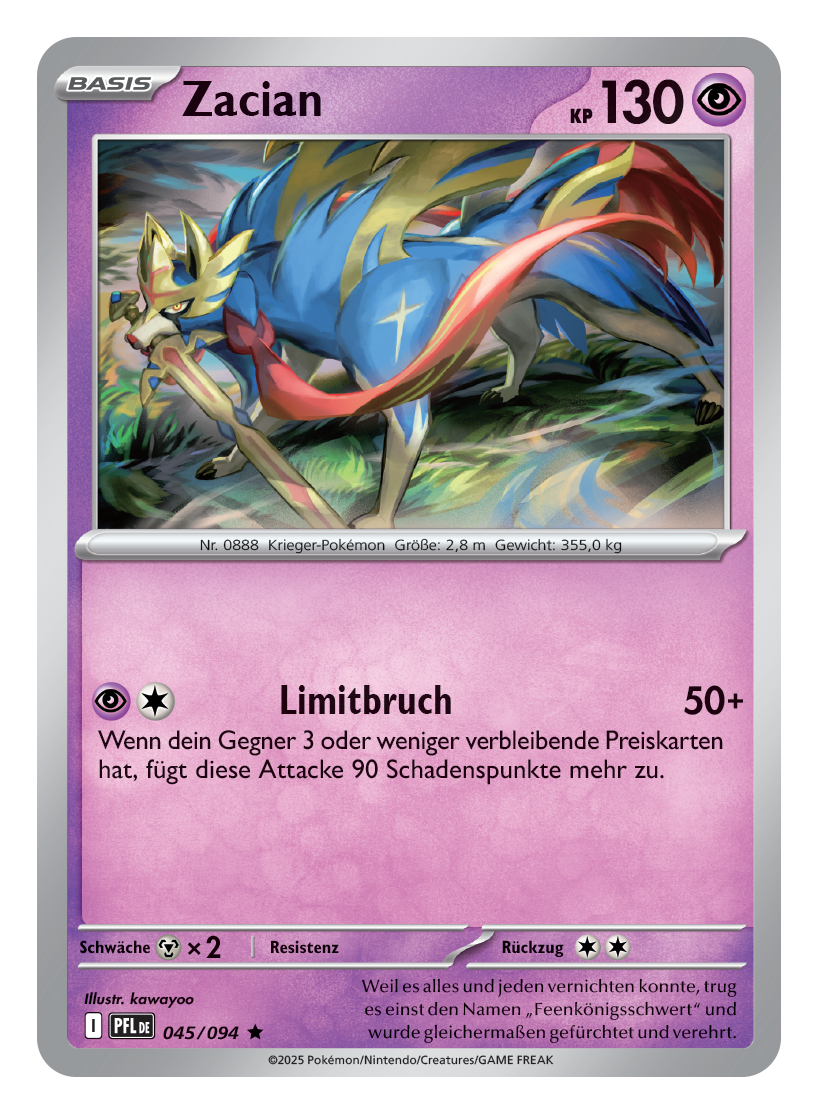 Ihr seht unten Zacian (45/094) mit seiner Attacke Limitbruch, die mindestens 50 Schadenspunkte zufügt. Hat euer Gegner drei oder weniger verbleibende Preiskarten, fügt die Attacke 90 Schadenspunkte mehr zu. Nicht schlecht für einen Angriff, der nur zwei Energiekarten benötigt.