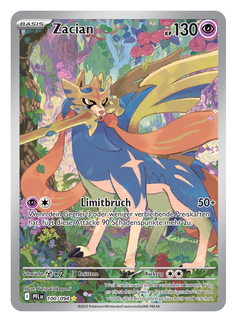 Zacian (100/094) kommt mit der gleichen Attacke daher, allerdings einer Vollbild-Illustration. Es handelt sich um eine Secret-Rare-Karte aus der neuen Erweiterung! Die Illustration stammt von Yoruyuki Ikegami. Wie gefällt euch die aufwändige Illustration?