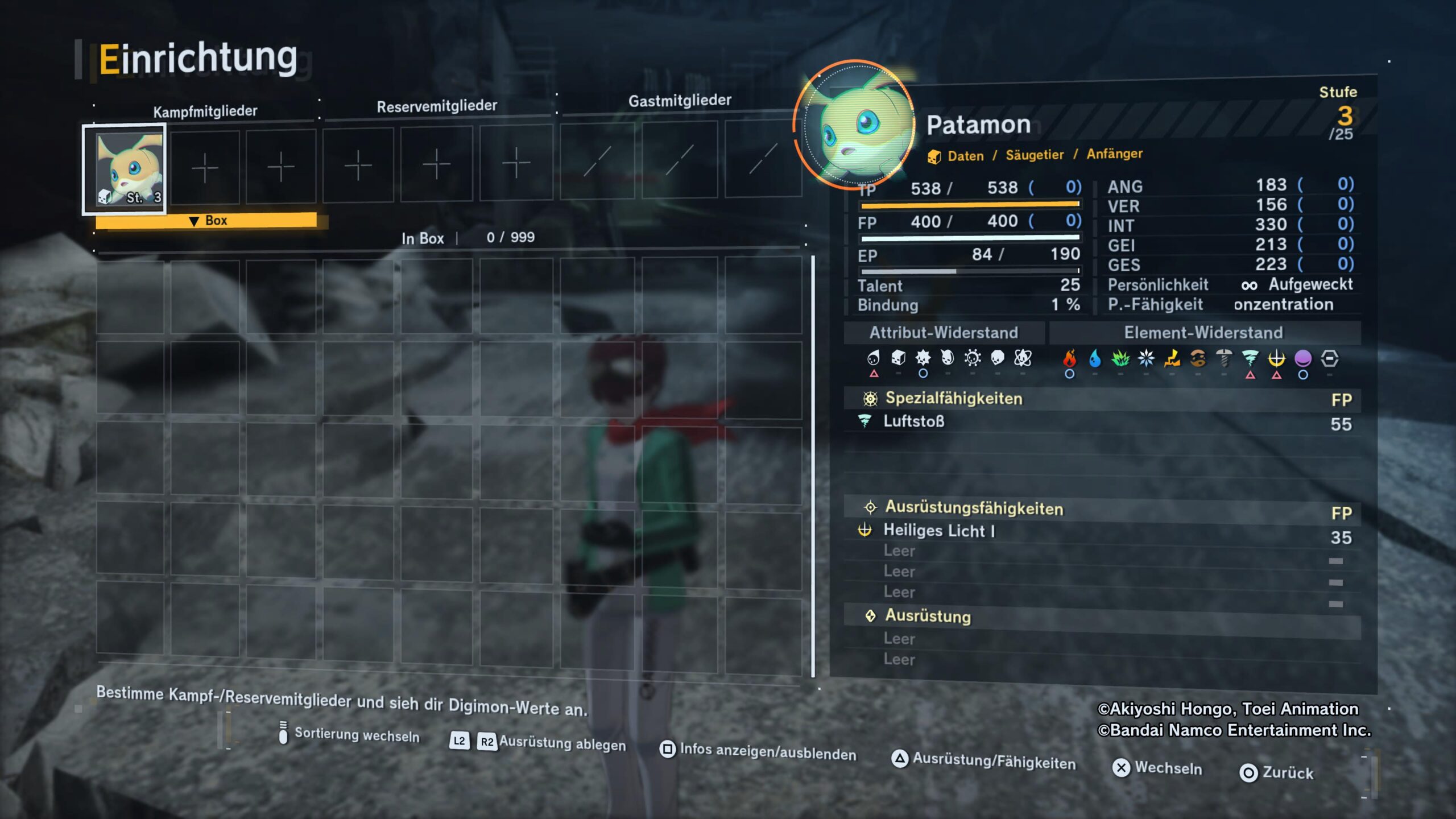 Das Schöne daran ist, dass euer Digivice scheinbar so viel Speicherplatz aufweist, dass ihr quasi all eure Digimon gleichzeitig mit euch tragen könnt. Euer Team besteht aus drei aktiven Digimon, drei als wechselbare Reserve und drei Gast-Digimon, die euch auf eurer Reise hin und wieder begleiten. Während die Gast-Slots für externe Digimon stets reserviert sind, können Digimon ganz bequem immer und überall vom Team zur Box und umgekehrt gewechselt werden. Das ist ziemlich praktisch und erhöht den Komfort erheblich.