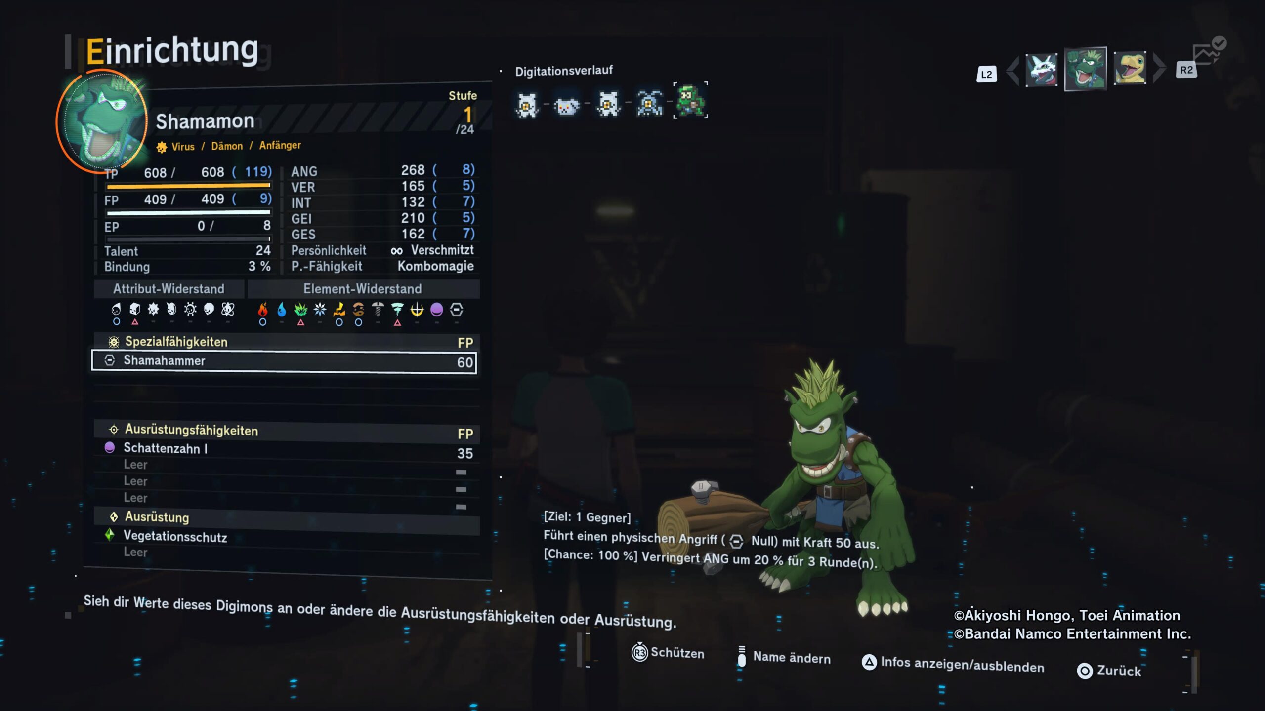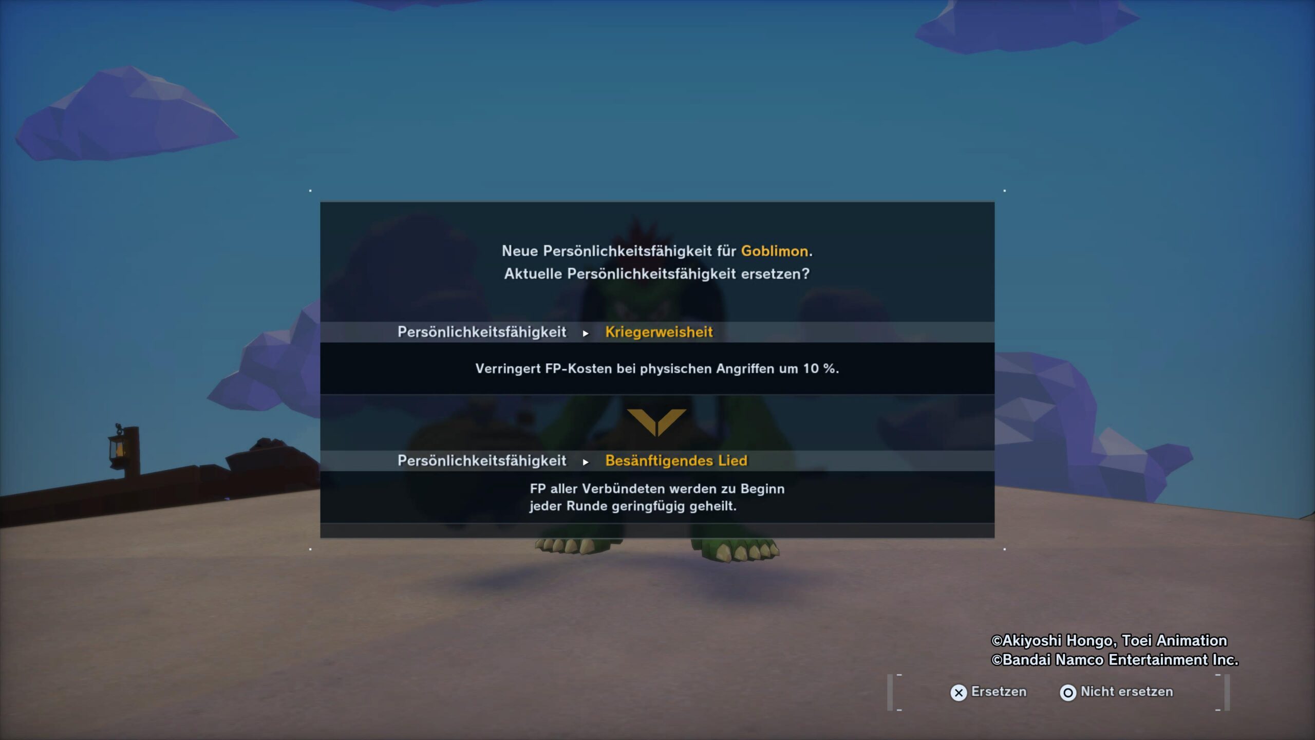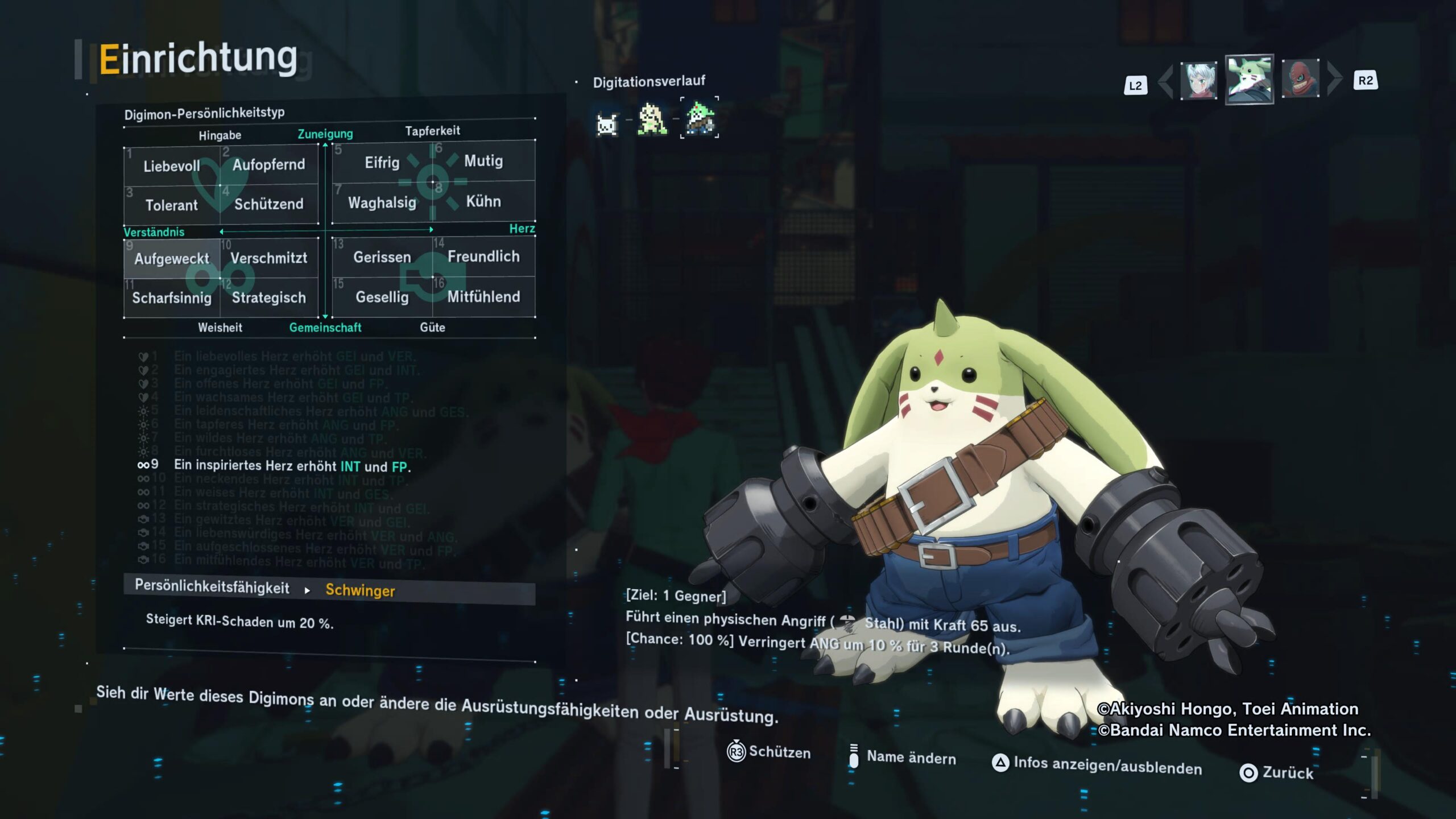 Zusätzlich gibt es Persönlichkeitsfähigkeiten. Das sind passive Fähigkeiten, die von der Persönlichkeit eures Digimons abhängen. Je nach Persönlichkeit werden unter anderem die Kosten für Kampffähigkeiten verringert, die Statuswerte zu Beginn eines Kampfes verbessert oder die FP der Digimon höher geheilt.
