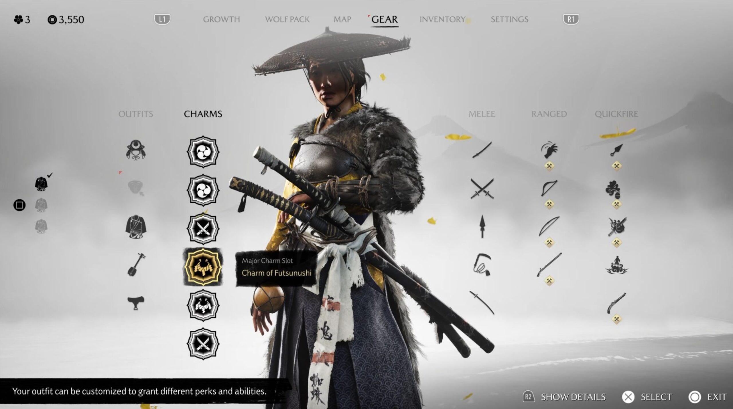 Neben allerlei Nahkampfwaffen wie Katana, Doppel-Katana, Kusarigama, Yari und Odachi gibt es auch unzählige Fernkampfwaffen wie Bögen, Kunai, Rauch- und Explosionsbomben und auch Flinte und Pistole dürfen genutzt werden. An Waffenvielfalt mangelt es Ghost of Yōtei also keinesfalls. Aber auch dutzende Rüstungen und Kopfbedeckungen gibt es zu finden.
