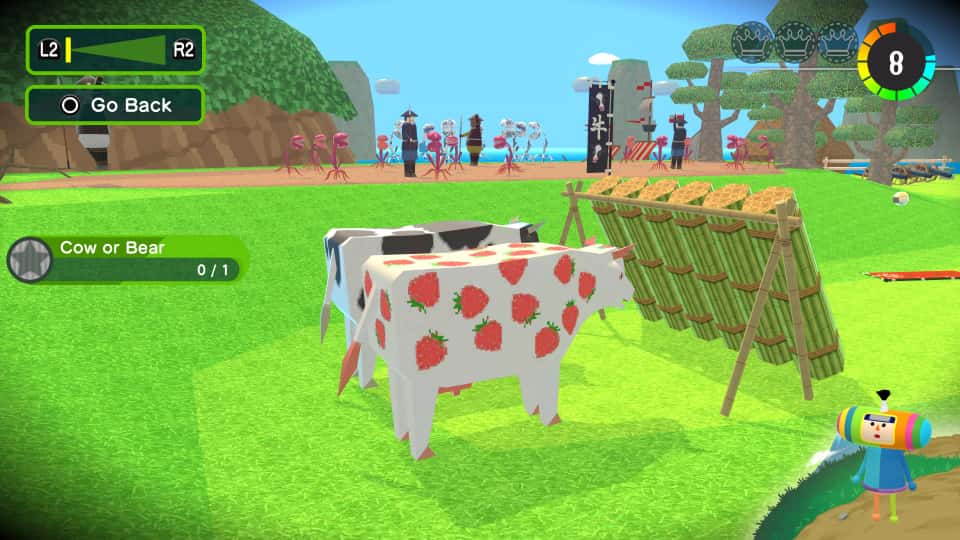 Besonders lustig ist ein Level, in dem wir in einem Krieg von Kühen gegen Bären teilnehmen. Welche Seite wir einnehmen, ist dabei uns überlassen. Hier müssen wir die größtmögliche Kuh oder den größtmöglichen Bären aufrollen – aber aufgepasst, wir dürfen nämlich nur eine einzige Kuh bzw. einen Bären aufrollen!