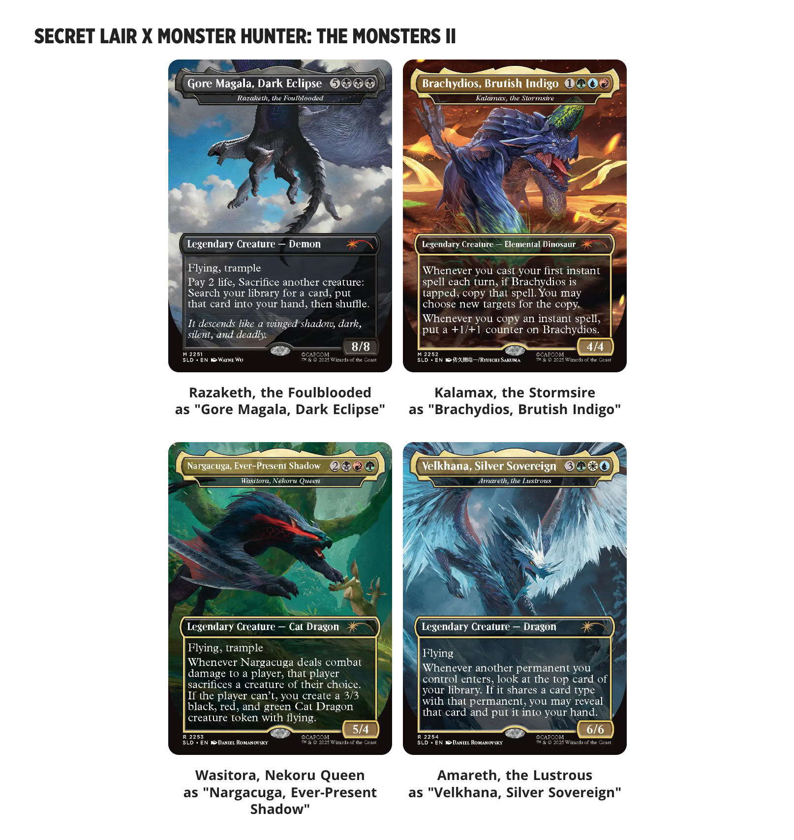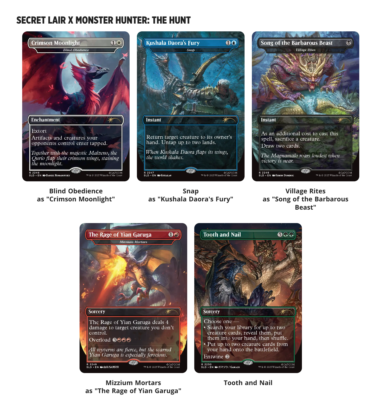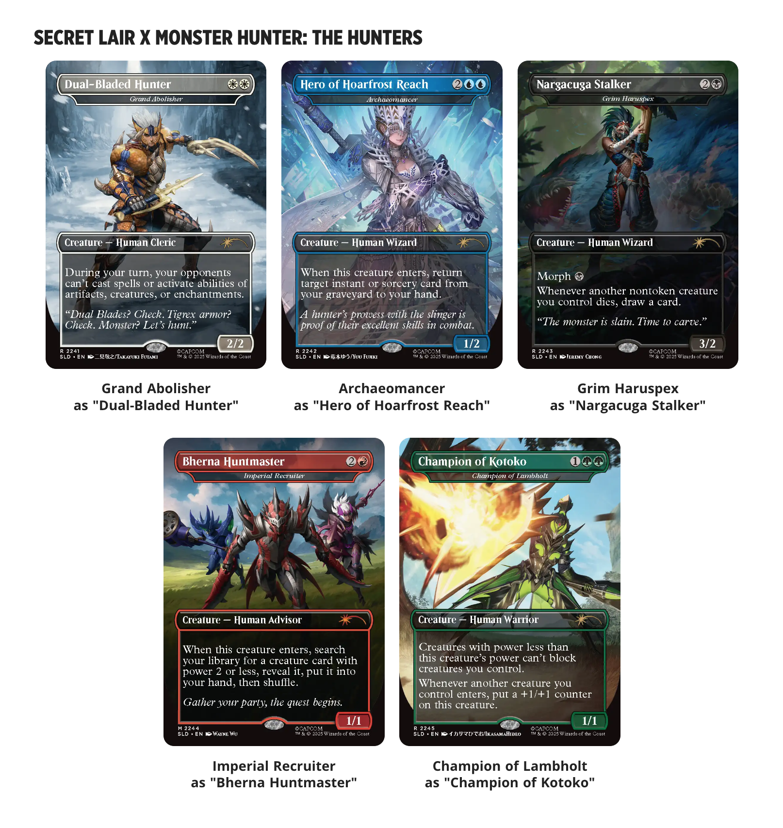 Das Problem liegt halt darin, dass es keine eigenständigen Karten sind, sondern nur so etwas wie Skins auf altere Karten. Die original Monster Titel stehen deshalb auch darunter. Man sucht sich halt einfach irgendwas raus, was passen könnte und verpasst dem ein Monsterhunter Artwork.