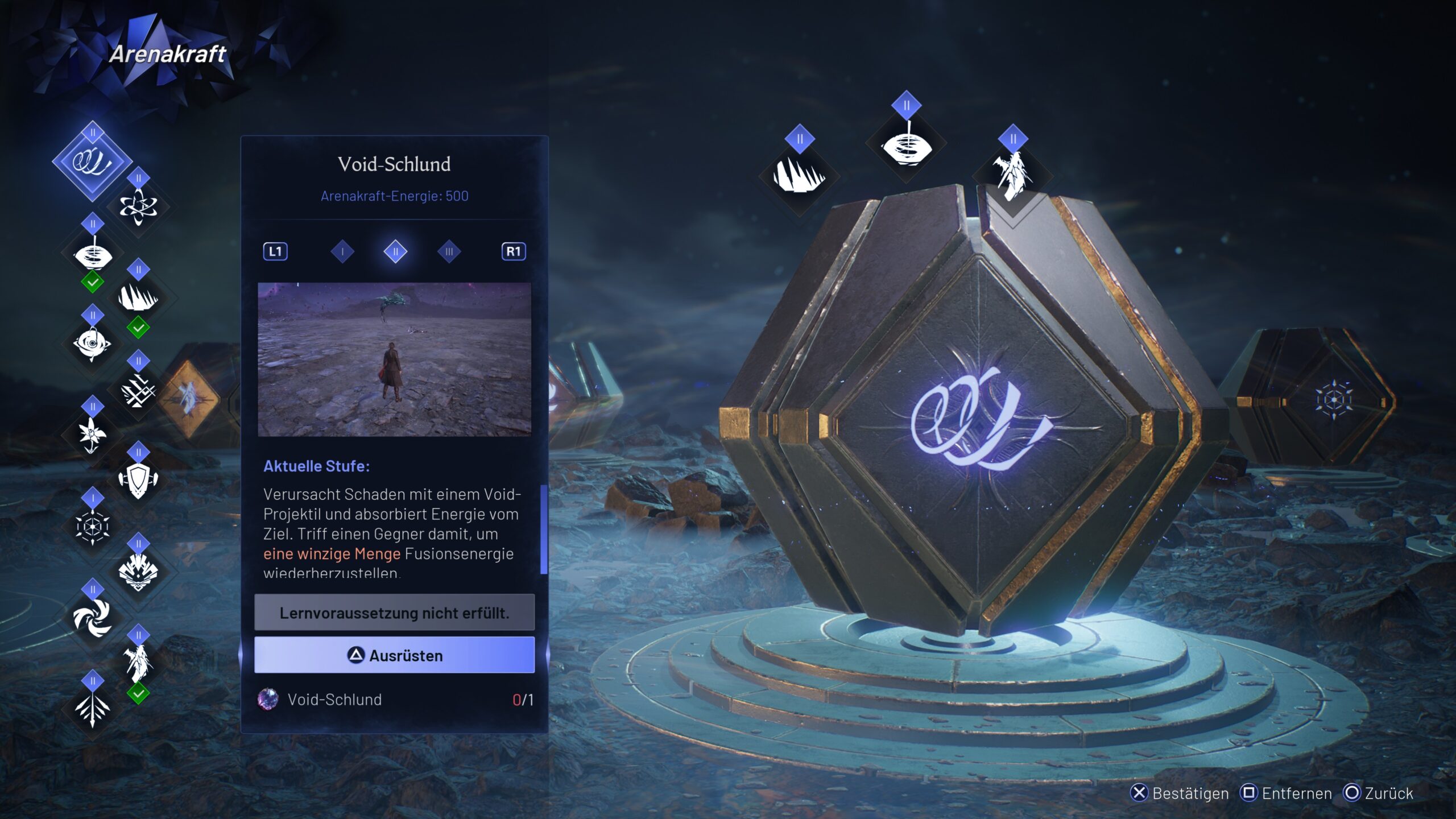 Zum einen könnt ihr, nachdem ihr eine größere Leiste gefüllt habt, mit Arena fusionieren. In diesem Modus könnt ihr über kurze Zeit die Drachenfähigkeiten von Arena freisetzen und hohen Schaden austeilen. Zusätzlich lernt ihr mit der Zeit verschiedene Voidrax-Fähigkeiten, die man zur einfacheren Einordnung als Zauber bezeichnen kann. Mit diesen könnt ihr z. B. Flammensäulen beschwören oder Schilde um euch herum entstehen lassen. Jede dieser Fähigkeiten kommt in zwei bis drei Ausbaustufen daher und bietet weitere Funktionen. Die Maximalstufen schaltet ihr allerdings erst mit einem New Game Plus frei.