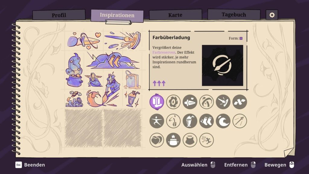 Mit sogenannten Inspirationen, die ihr unterwegs findet, könnt ihr euren Spielstil weiter anpassen und so beispielsweise die Lebensregeneration fördern, um noch aggressiver spielen zu können. Oder ihr geht auf Nummer sicher und rüstet Inspirationen aus, die euch einen größeren Farbvorrat und höhere Verteidigung bieten. Da sich viele Upgrades hinter trickreichen Hindernissen verbergen, die ihr zunächst überwinden müsst, fühlt es sich umso befriedigender an, eine Belohnung einzustreichen und ermutigt dadurch, alles genauestens unter die Lupe zu nehmen.
