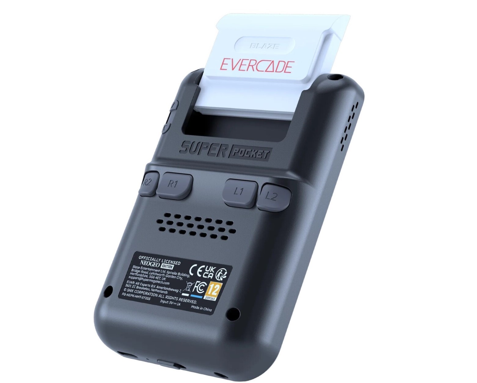 Neben den üblichen Tasten auf der Vorderseite bietet der Super Pocket außerdem auch vier Schultertasten auf der Rückseite des Geräts. So hält sich der Hersteller Blaze die Möglichkeit offen, auch moderne Titel auf dem Handheld spielen zu können, die mehr Tasten als die Standardbelegung erfordern.