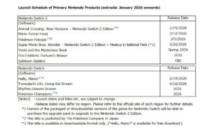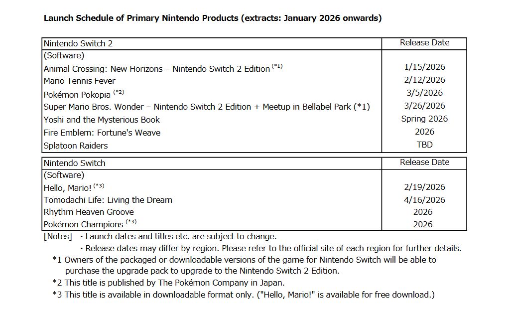 Nintendo unterteilt die Pläne diesmal in eine Switch-1-Liste und eine Switch-2-Liste. Neue Nennungen gibt es natürlich nicht. Die Übersichtlichkeit der Switch-1-Liste lässt sich noch ganz gut begründen, die Switch-2-Liste dürften viele Nintendo-Fans aktuell ein wenig knapp finden. Die nächste Nintendo Direct, die angeblich schon in den nächsten Tagen stattfinden soll, dürfte das ändern.