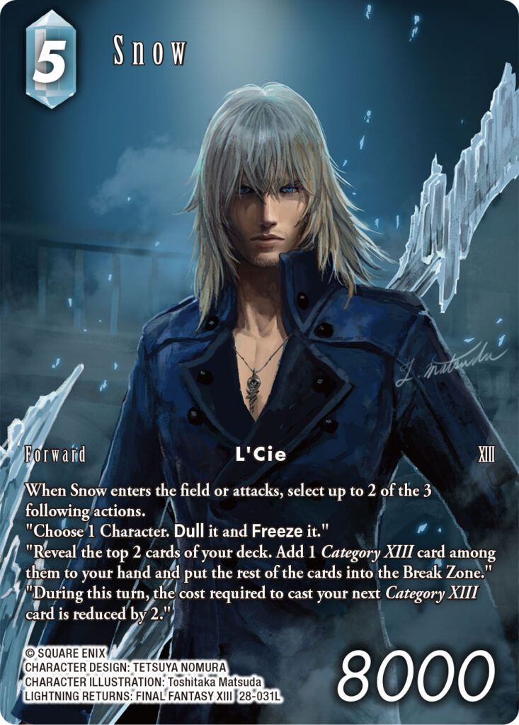 Neben den regulären Karten enthält das Set weiterhin Legacy Cards – Vollkunstkarten auf Basis früherer Legend Cards. Die drei enthaltenen Karten sind Galuf [7-067L], Terra [23-011L] und Bahamut (XVI) [24-110L]. Mit dabei sind weiterhin Illustrationen von Rubi Asami, Ryoma Ito, Isamu Kamikokuryo, Fumio Minagawa und Toshitaka Matsuda. Die Künste von Toshitaka Matsuda kennt ihr aus Lightning Returns: Final Fantasy XIII. Er steuert unter anderem Snow [28-031L] zum Set bei.