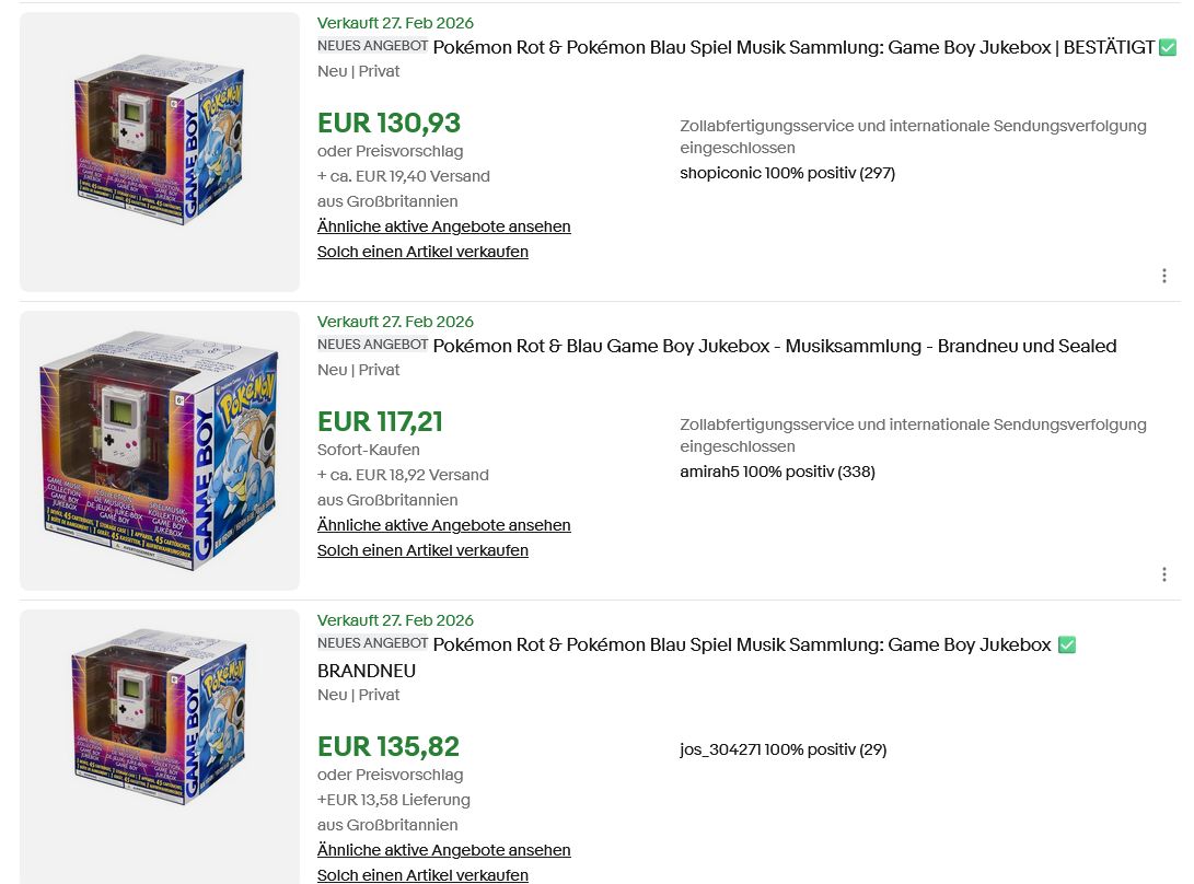 Bei Ebay werden die kleinen Game-Boy-Audioplayer aktuell für doppelte Preise angeboten. Aus Großbritannien könnt ihr euch für 130 Euro aufwärts zzgl. Versand ein Gerät schicken lassen. Unzählige Geräte wurden für dreistellige Preise auch schon verkauft, wie der nachfolgende Screenshot zeigt und wie ihr mit einer Ebay-Suche auch schnell selbst herausfindet.