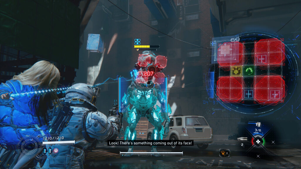 Auch, weil mit ihnen spaßige, neue Variationen von Dianas Hacking einhergehen. Haben wir einen solchen Quasi-Titanen zu Genüge bearbeitet, schützt er sich vor weiteren Hacking-Versuchen. Dann gilt es, die roten Ziele in seinem Gesicht zu beseitigen, um Hacks wieder möglich zu machen.