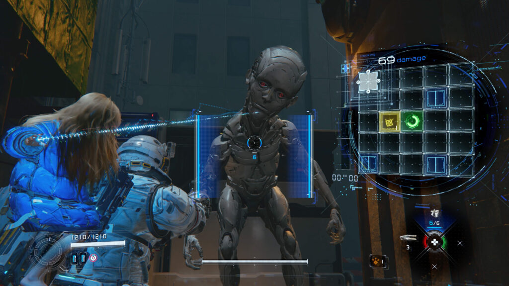 Den spielerischen Höhepunkt erleben wir im Bosskampf mit einem gewaltigen Roboter-Insekt. Die Keilerei mit dem Biest ist nicht nur audiovisuell beeindruckend, sondern spielerisch hochgradig spaßig. In angenehm fordernder Art fragt uns der Kampf sämtliche bis dato erlernten Fähigkeiten ab. Wir hacken uns durch ein deutlich komplexeres Raster, weichen Hieben aus und nehmen Störsender ins Visier, sobald das Biest unsere Hacks beeinträchtigt.