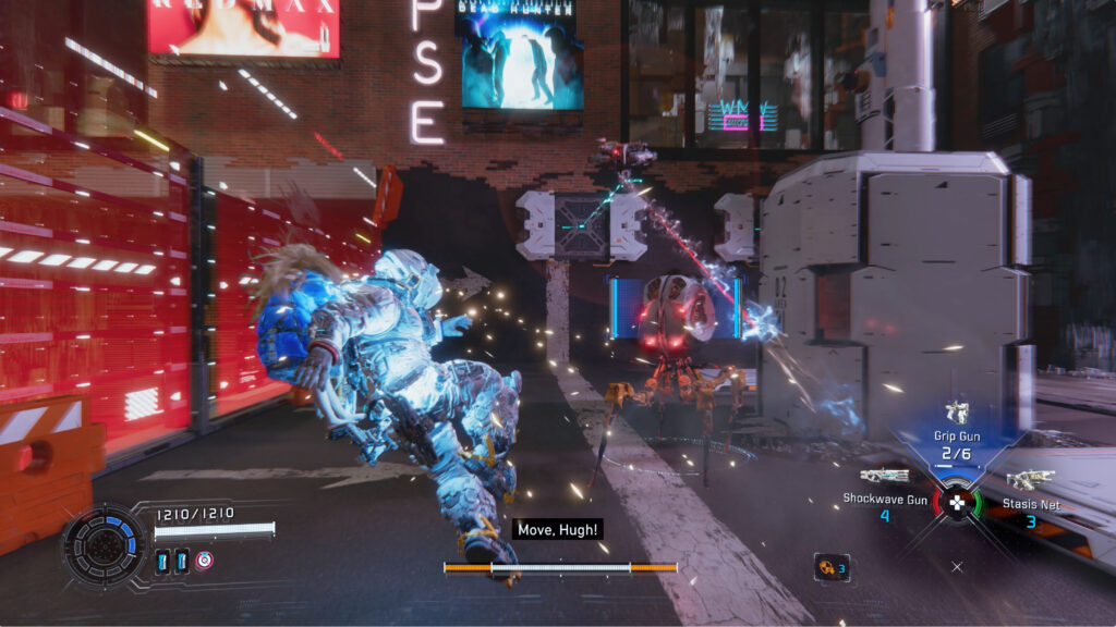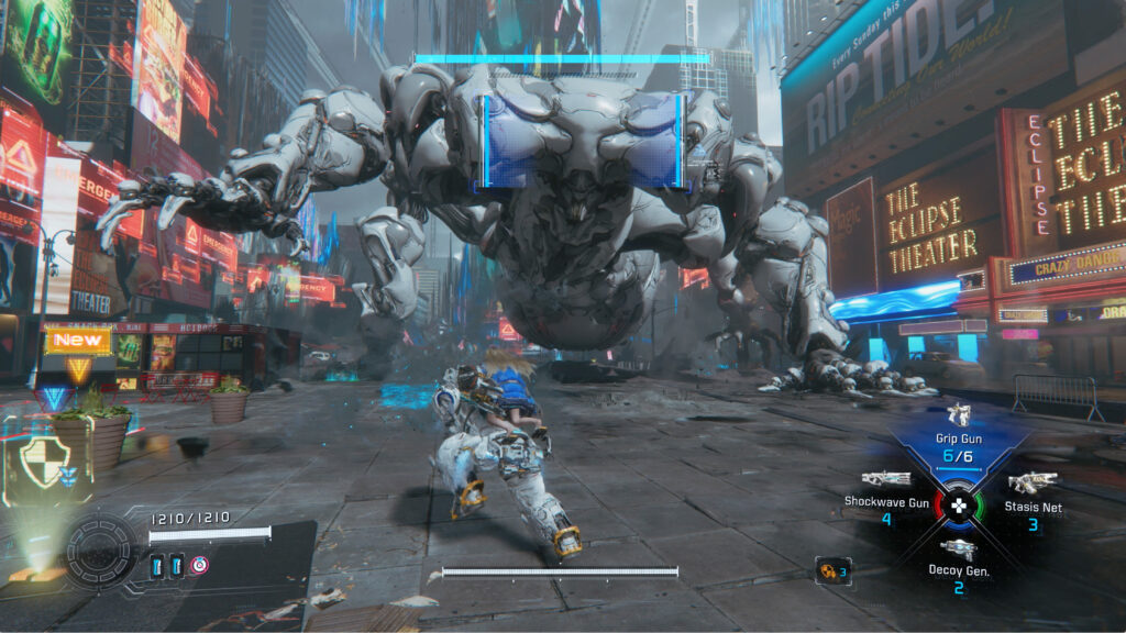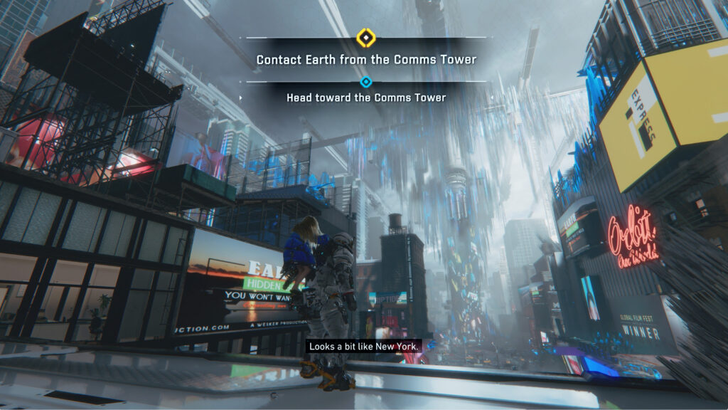 Naja, nicht ganz – die weltbekannte Kulisse des Times Square steht allerdings Modell für eine großflächige Simulation, die als Spielplatz für unsere Mission herhält. Die verquere Sci-Fi-Version des Big Apple ist ein echter Augenschmaus, viel Zeit zum Staunen bleibt aber nicht. Als uns eine turmhohe Blockade den Weg versperrt, gilt es diverse Sender in der Umgebung zu entschärfen – nur so können wir unsere Reise fortsetzen.