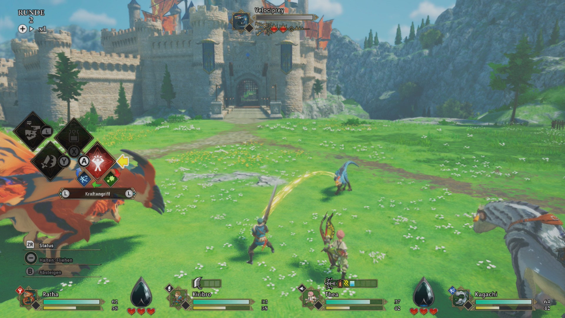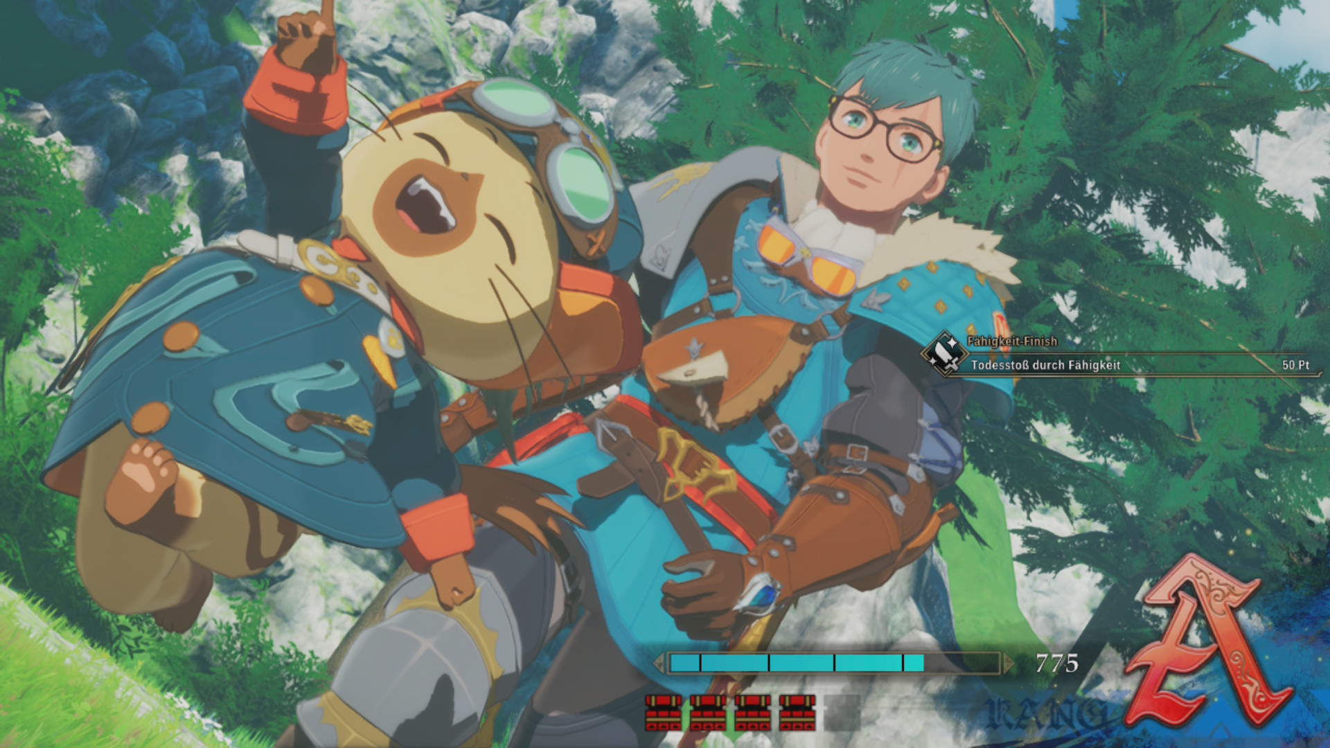 Einmal umgeworfen, geht es zu viert mit einem Synchronansturm auf das Monster. Dabei wird nicht nur enormer Schaden verursacht, sondern der Angriff füllt ebenfalls die Bindungsanzeige schnell auf. Ist diese aufgefüllt – was auch bei normalen Angriffen und Fähigkeiten passiert –, kann eine mächtige Bindungsfähigkeit entfesselt werden. Das sind spezielle Fähigkeiten, die immer wieder für ein kleines Highlight während des Kampfes sorgen, denn jedes Monstie besitzt eine individuelle Bindungsfähigkeit.