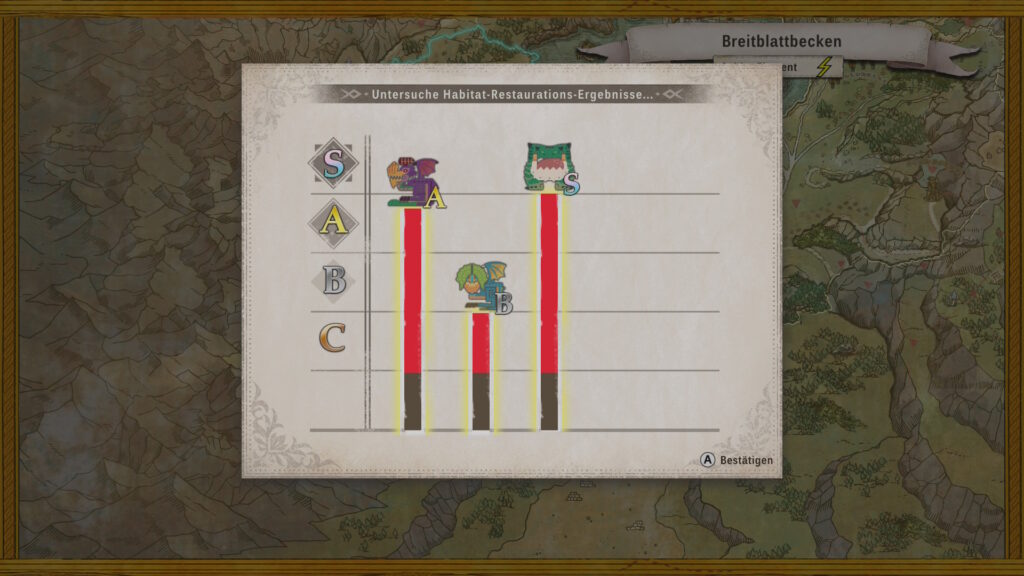 Immerhin findet man Informationen über einige einheimische Wesen sowie der Monster in der Monsterklopädie. Dort werden sie nicht nur wunderschön präsentiert, sondern ihr erfahrt auch als SpielerIn etwas über das Verhalten der Monster und darüber, wie ihr an die Unterarten in einem Habitat herankommt. So werdet ihr zu richtigen Rangern und lernt das Ökosystem zu verstehen.