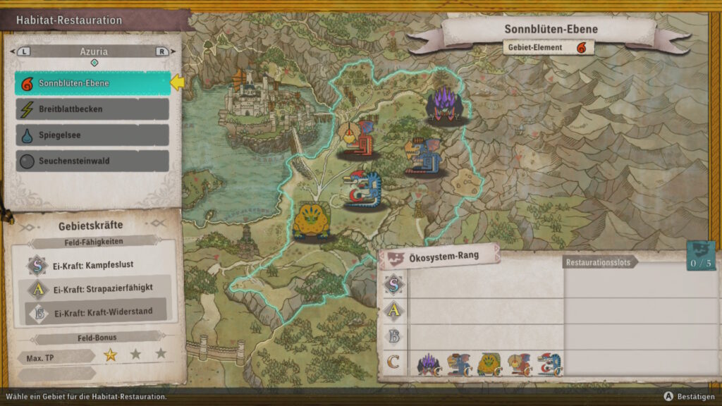 Jedes Gebiet ist in mehrere Bereiche unterteilt, die unterschiedliche Grundelemente aufweisen. Wenn der Ökosystem-Rang im jeweiligen Gebiet hoch genug ist und ihr euch auf die Suche nach neuen Eiern macht, findet ihr zwar die gewöhnlichen Eier, zum Beispiel die eines Tobi-Kadachi oder eines Anjanath, jedoch besitzen die Monster mehr als nur ihr ursprüngliches Element und haben eine andere Farbe beim Ausbrüten. So wird ein Tobi-Kadachi rötlich, wenn dessen Ei im Feuerbereich gefunden wird und ein Anjanath grün, wenn aus dem Blitz-Gebiet stammt. Da stellt sich doch die Frage, wie gut die Auswilderung wirklich für das Ökosystem ist.